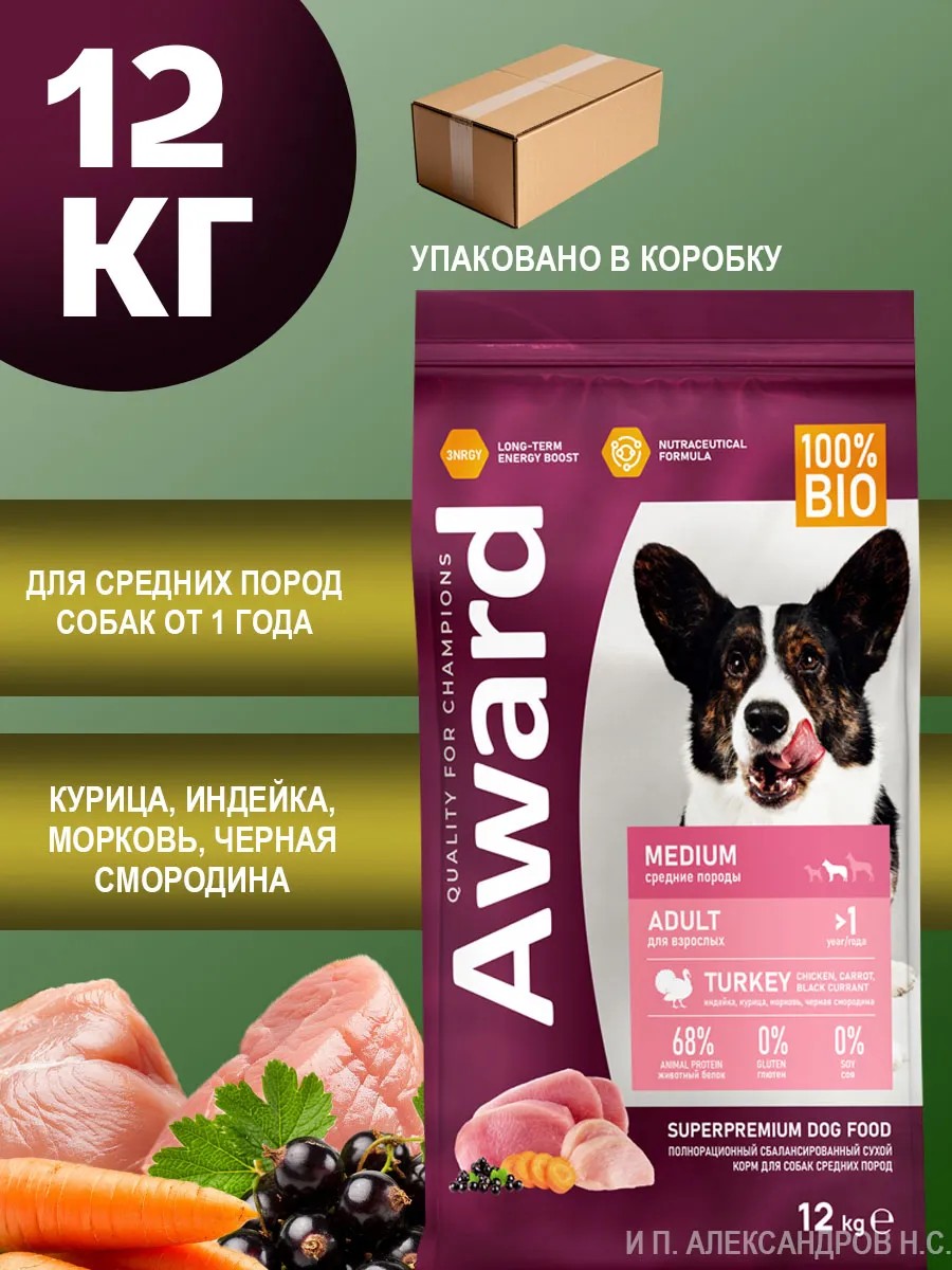 AWARD Сухой корм 12кг для собак средних пород с индейкой и курицей