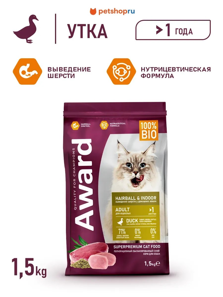 AWARD Сухой корм для кошек, утка и индейка, 1,5 кг