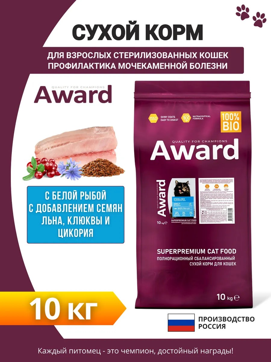 AWARD Сухой корм для кошек белая рыба, клюква 10кг