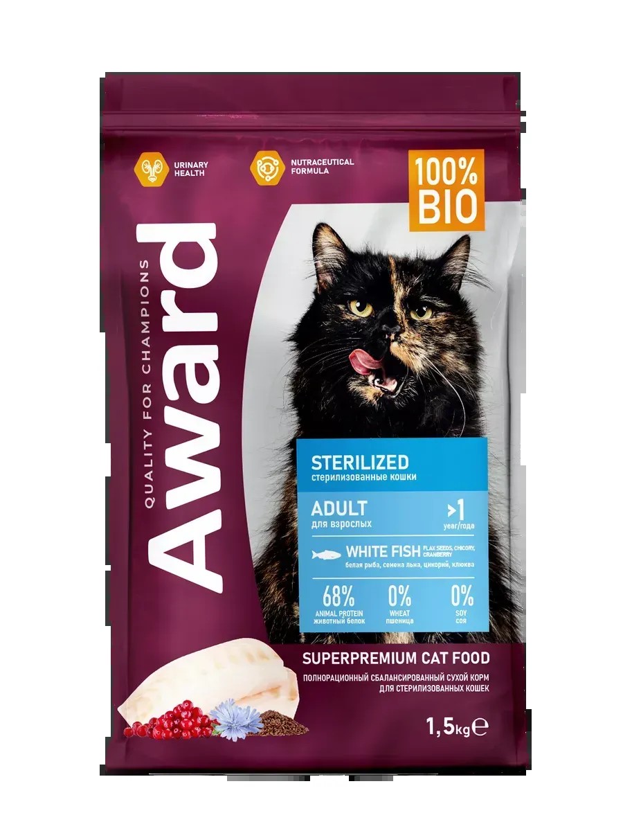 | Полное наименование товара | AWARD Sterilized сухой корм для взрослых стерилизованных кошек, с белой рыбой, семенами льна, клюквой и цикорием - 1.5 кг |