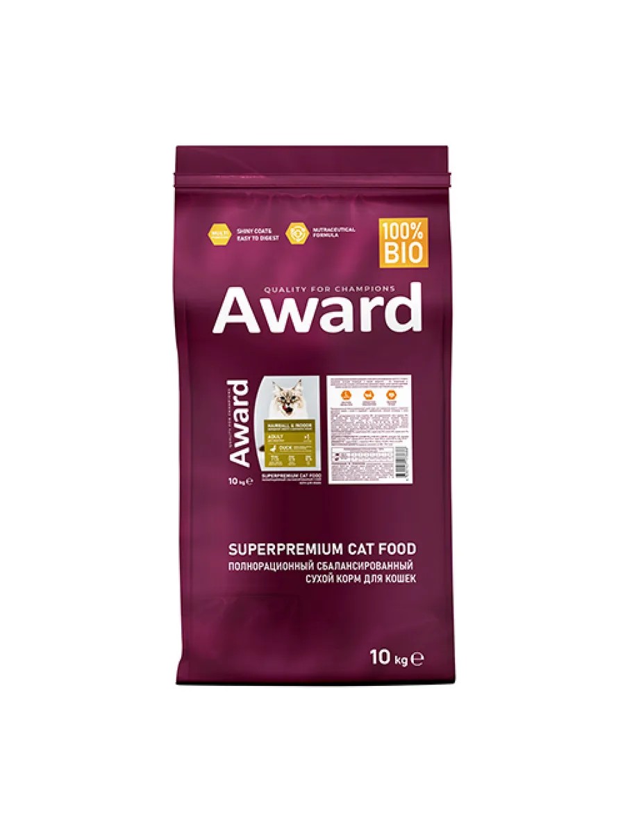 AWARD Корм для домашних кошек выведение шерсти утка индейка 10кг