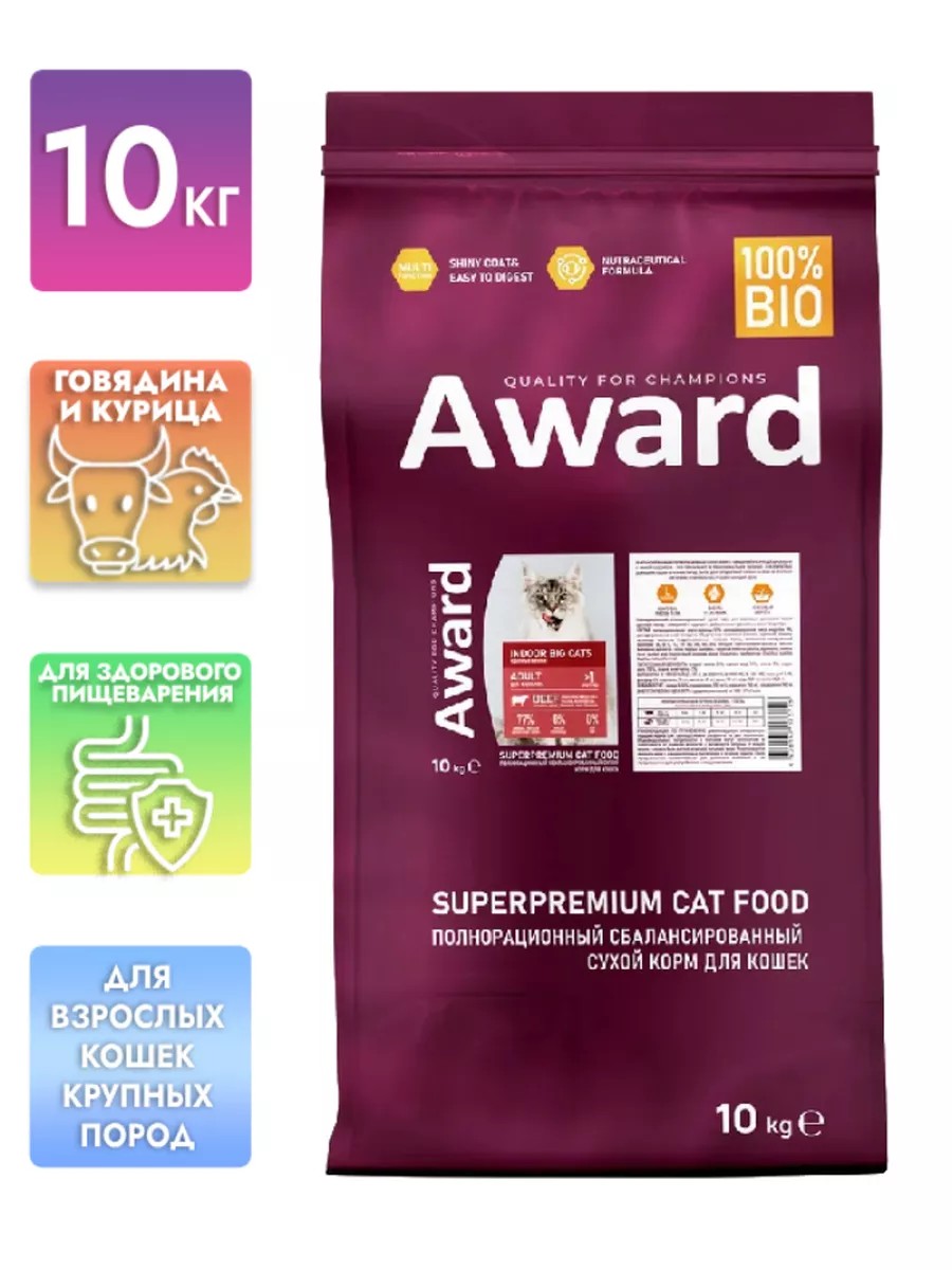 AWARD Корм для домашних крупных кошек говядина и курица 10кг