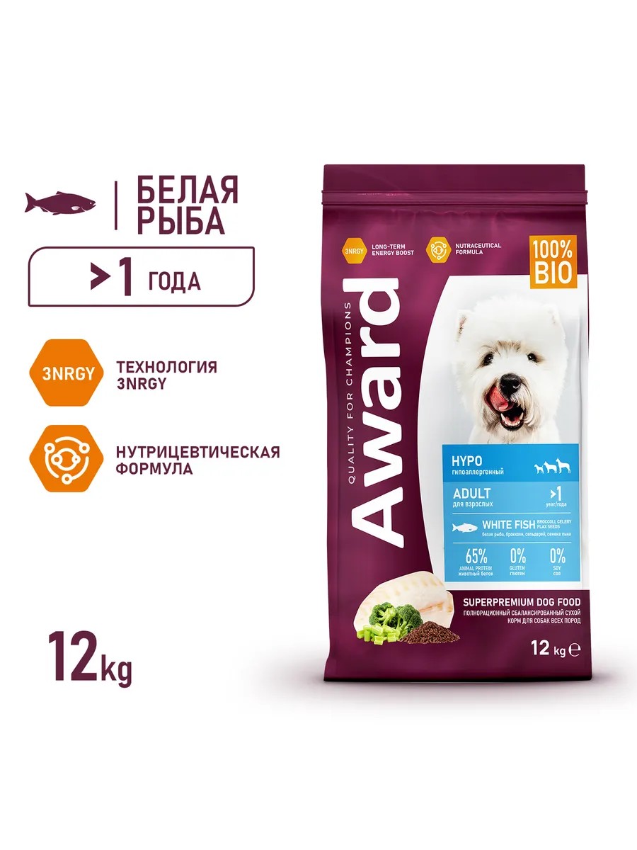 Сухой корм AWARD HYPO для взрослых собак всех пород с белой рыбой с добавлением брокколи, сельдерея и семян льна 2 кг. Корм изготовлен из 100% натуральных ингредиентов по инновационной формуле — это обеспечивает комплексную нутрицевтическую поддержку организма питомца. Подойдет для для собак всех пород с повышенной чувствительностью к компонентам корма. Источник белка — белая рыба, источник углеводов — рис. При изготовлении корма использовалась технология 3NRGY — сочетание полезных углеводов, дающее длительный запас энергии и чувство сытости. Корм обогащен полиненасыщенными жирными кислотами, которые повышают качество шерсти и укрепляют иммунитет. Пробиотики и пребиотики помогают сохранять естественный баланс кишечной микрофлоры и способствуют оптимальному усвоению питательных веществ. Без красителей и консервантов.