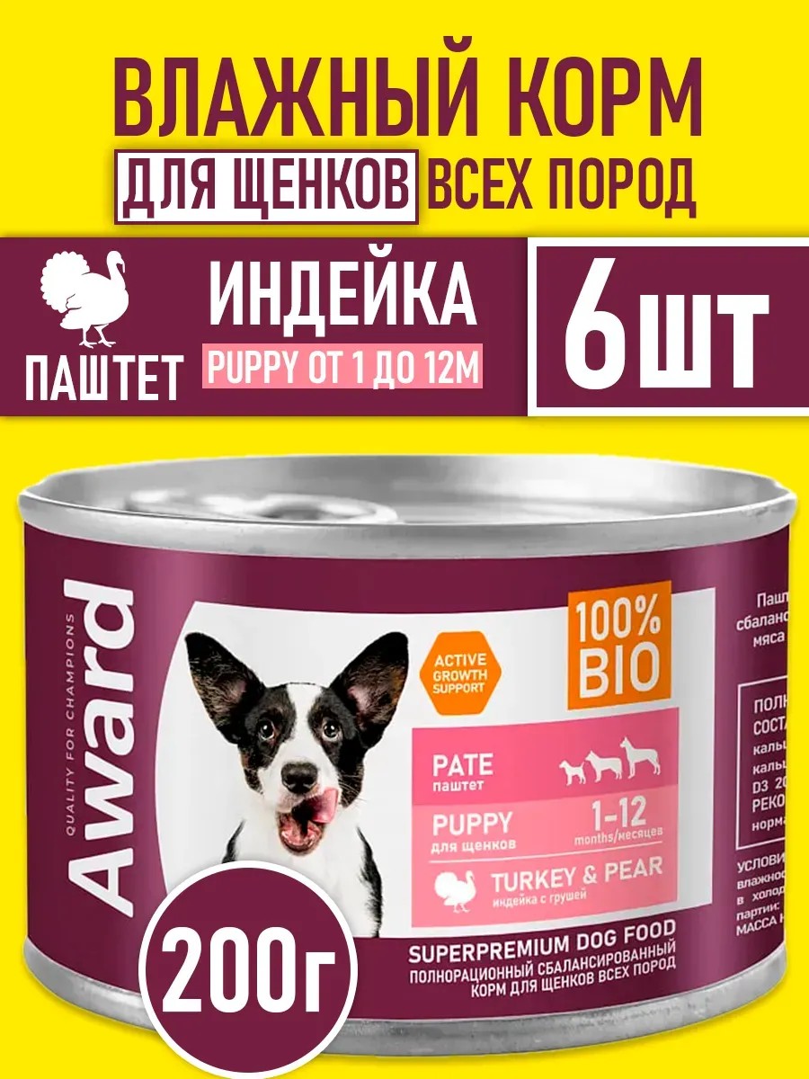 | Комплектация | Влажный корм AWARD для щенков от 1 месяца паштет из индейки с грушей 200г х 6шт. |