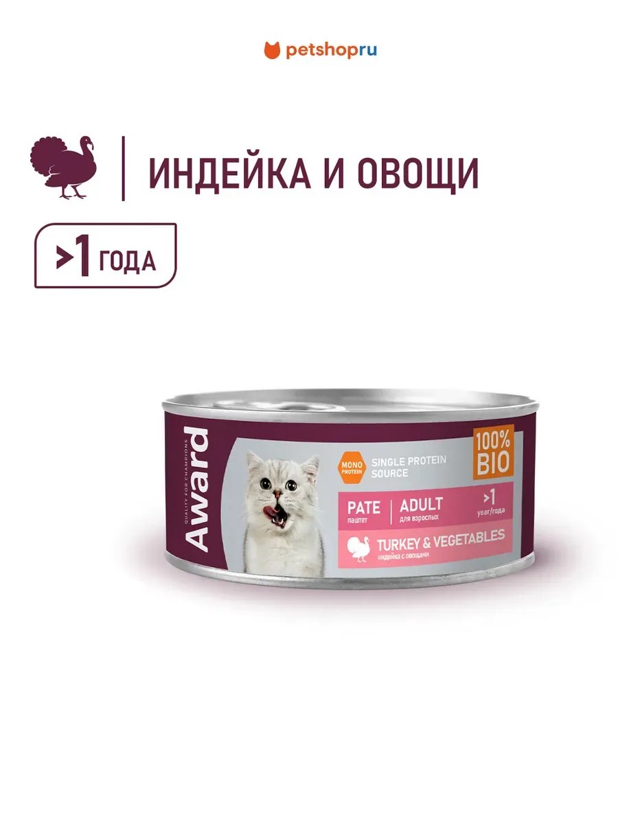 Влажный корм AWARD для взрослых кошек паштет из индейки с овощами 100г. Паштет из индейки с кусочками овощей для взрослых кошек - это монопротеиновое сбалансированное питание для любимого питомца, изготовленое из одного вида мясного белка без содержания зерна и глютена, с добавлением овощей и фруктов богатых витаминами и минералами.