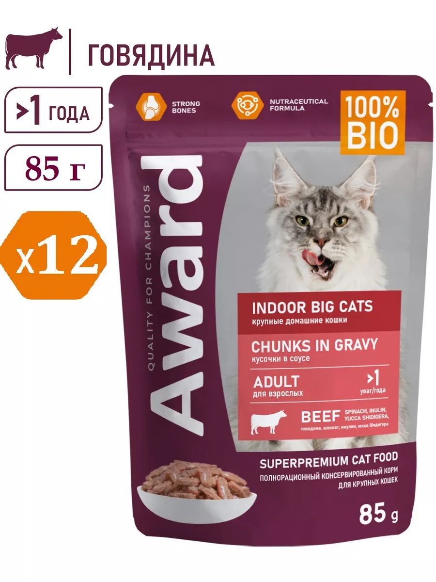 | Полное наименование товара | Влажный корм AWARD Indoor big cats для взрослых домашних кошек крупных пород кусочки в соусе с говядиной 85г |