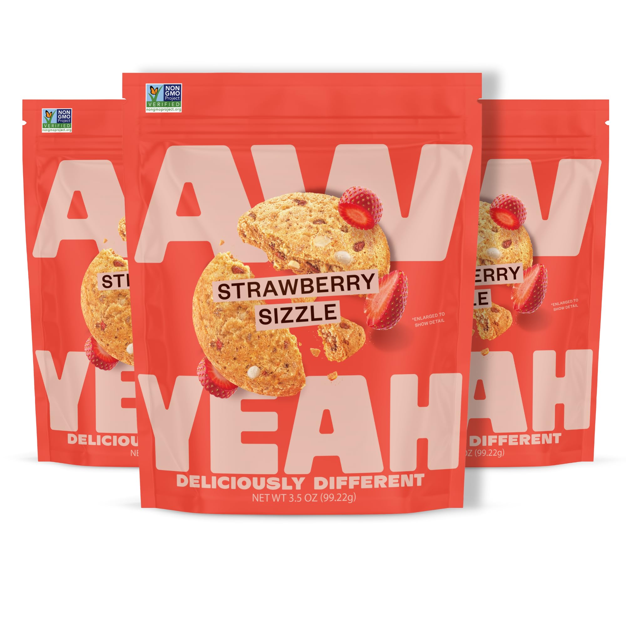AwYeah Strawberry Sizzle Mini Cookies – Sweet, Spicy, and Surprisingly Healthy! Introducing AwYeah, the cookie that changes everything. Our Strawberry Sizzle flavor is the perfect blend of succulent strawberry, sweet spicy heat, a twist of lime, and a hint of sea salt—a combination that's equal parts indulgent and unexpected. This isn't your typical cookie. Small in size, massive in personality, every bite of AwYeah delivers unusually delicious flavor, with a surprising sweet-spicy kick that's unlike anything you've ever tasted. Packed with real fruit, and crafted with care, AwYeah cookies are a better-for-you indulgence that satisfies your sweet tooth without compromise. These mini cookies are gluten-free, dairy-free, vegan, and plant-based, so everyone can enjoy their poppable goodness. Plus, they're made with non-GMO ingredients and no artificial flavors, making them the perfect guilt-free treat to grab on the go. Why AwYeah? Gourmet flavor: Bold, sweet, and spicy, with a burst of real fruit and a dash of lime. Unusually healthy: A surprising balance of indulgence and nutrition, without the junk. Small but mighty: Mini cookies with massive flavor and personality. All-natural goodness: Dairy-free, gluten-free, vegan, and plant-based with zero compromises. Perfect for any craving: Whether you're snacking, treating yourself, or sharing with friends, AwYeah is always the unexpected delight. The cookie you've been waiting for. Ready to experience something different? Give AwYeah Strawberry Sizzle a try, and see why this little cookie is set to change everything. Unexpected, in every way. Think we're a little strange? Well, sure. Aren't you?Perfect for any craving: Whether you're snacking, treating yourself, or sharing with friends, AwYeah is always the unexpected delight. All-natural goodness: Dairy-free, gluten-free, vegan, and plant-based with zero compromises. Small but mighty: Mini cookies with massive flavor and personality. Unusually healthy and made with real fruit: A surprising balance of indulgence and nutrition, without the junk. Gourmet flavor in a mini cookie: Bold, sweet, and spicy, with a burst of real fruit and a dash of lime.
