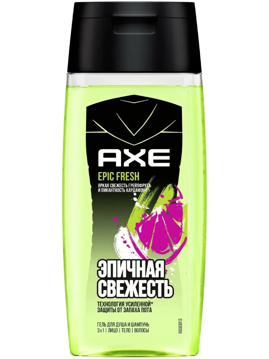 Гель для душа и шампунь 3 в 1 Epic Fresh не содержит парабены, эффективно смывает бактерии, очищает и ухаживает за кожей и волосами пока ты в душе. Отлично подойдет для умывания лица. Все, что нужно для чистой, увлажненной, ухоженной кожи и волос, к которым хочется прикасаться. Крутой аромат с аккордами грейпфрута и нотками кардамона – самая долгая свежесть от AXE*. Дерматологически протестирован. *в линейке продукции Unilever.