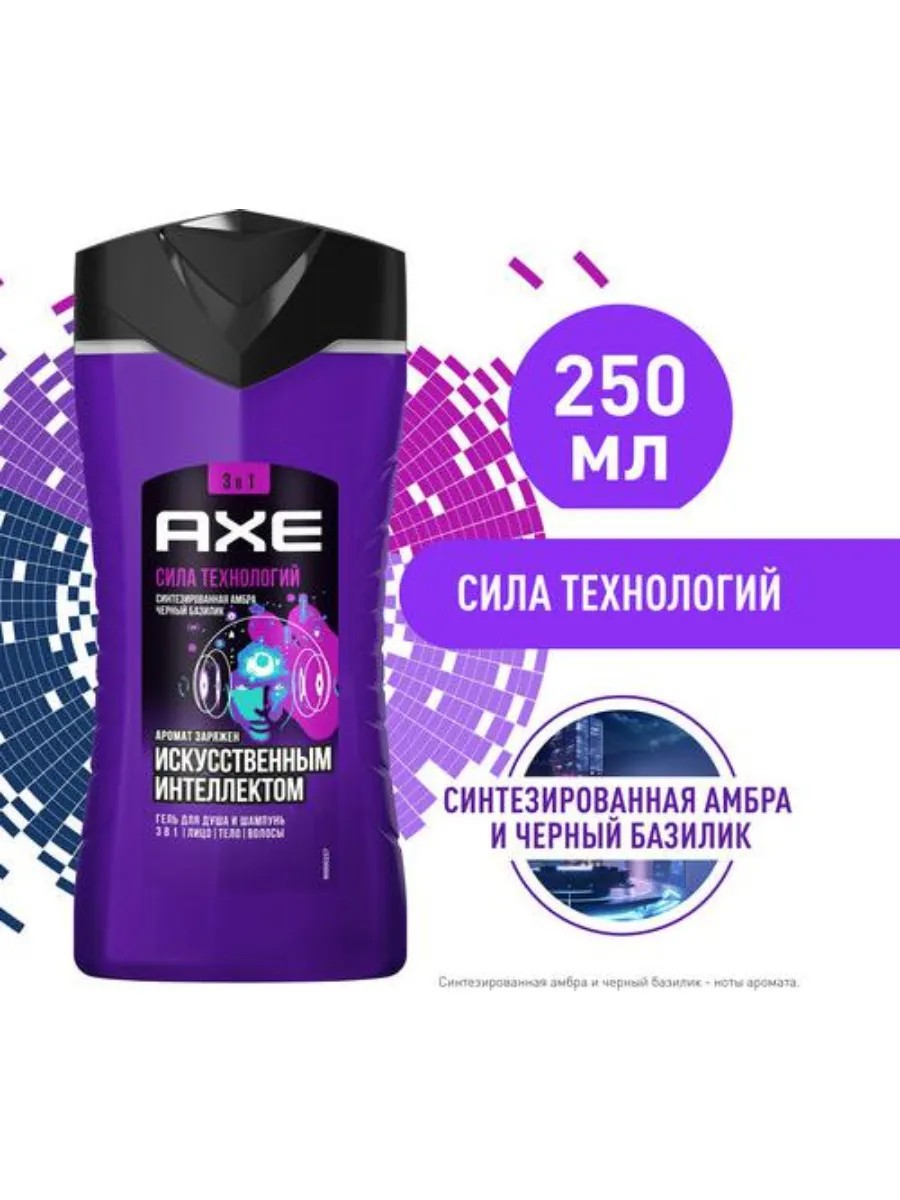 AXE Сила технологий заряжена искусственным интеллектом. Гель для душа и шампунь “Сила технологий” — итог нашего маленького эксперимента. Что будет, если ноты для парфюмерной композиции будет выбирать искусственный интеллект? Будет ярко, дерзко и незабываемо: вполне в духе AXE! Любишь играть на контрастах? В аромате нашего геля для душа соединены черный базилик, амбра, кориандр и имбирь, а также корица, кашемировое дерево и ваниль. А еще AXE Сила технологий —- это средство 3в1: гель для душа, шампунь и средство для умывания. Есть две стороны силы: выбери свою!