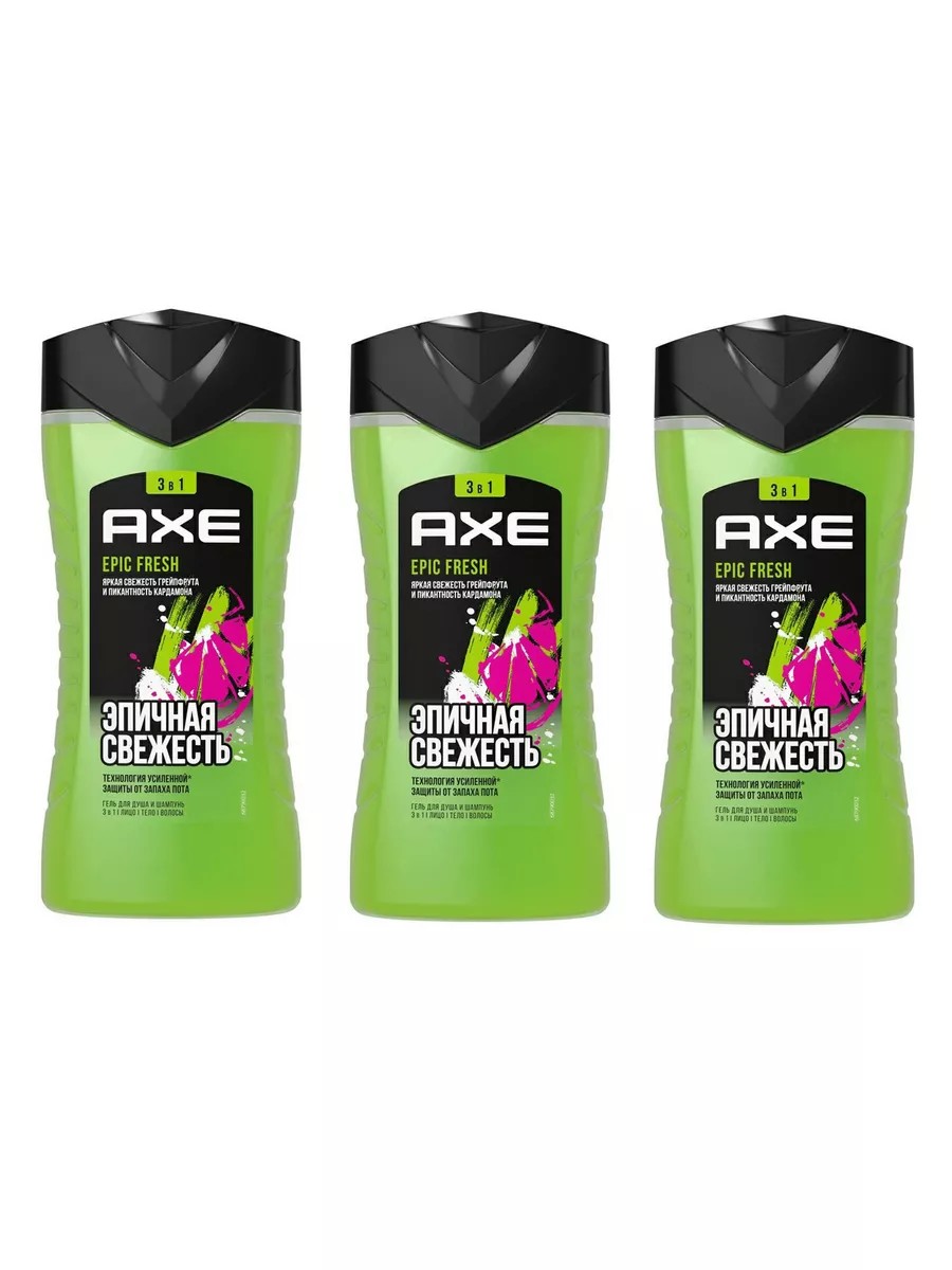 Set of 3. Axe Shower Gel + Shampoo 3 in 1 Epic Fresh, 250 ml. Made with enhanced anti-odor technology. The paraben-free formula effectively washes away bacteria, cleanses, and conditions skin and hair while you shower. Use this product to wash your face. It contains plant-based prebiotics and moisturizing ingredients. This means that with regular use, you'll get clean, hydrated, well-groomed skin and hair you'll want to touch. A captivating fougere scent with grapefruit accords and cardamom notes. This convenient format is perfect for post-workout use or taking on vacation.