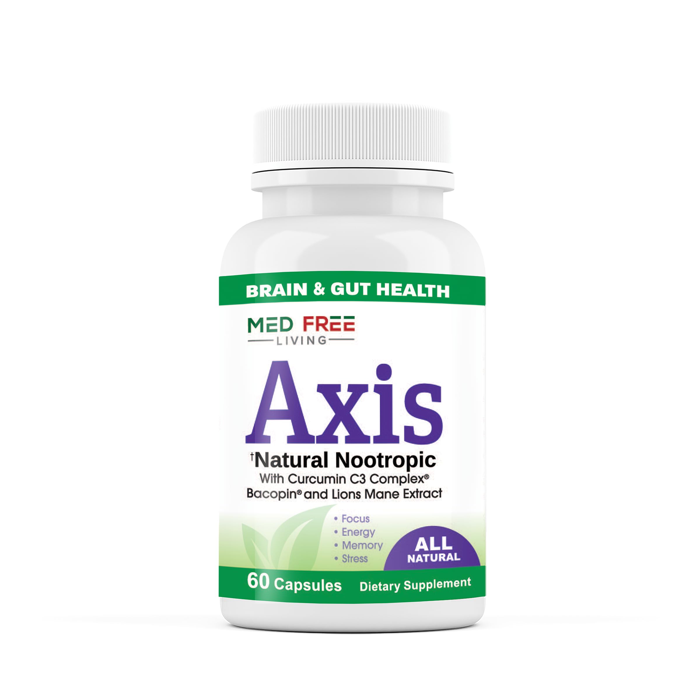 Unlock your full cognitive and digestive potential with Axis, a Natural Nootropic from Med Free Living. This powerful, all-natural supplement made with trademark ingredients is formulated to support brain and gut health, that may help you achieve enhanced focus, sustained energy, and stress relief. Featuring a potent blend of Curcumin C3 Complex (95 curcuminoids), Bacopin (Bacopa monnieri), and Lion's Mane Extract, Axis is designed to promote mental clarity, memory, and overall well-being. Each serving also includes L-Theanine and BioPerine (black pepper extract) that can help to optimize absorption and effectiveness. With 60 capsules per bottle, this GMP-certified, lab-tested supplement is your go-to solution for a sharper mind and a healthier gut—naturally.