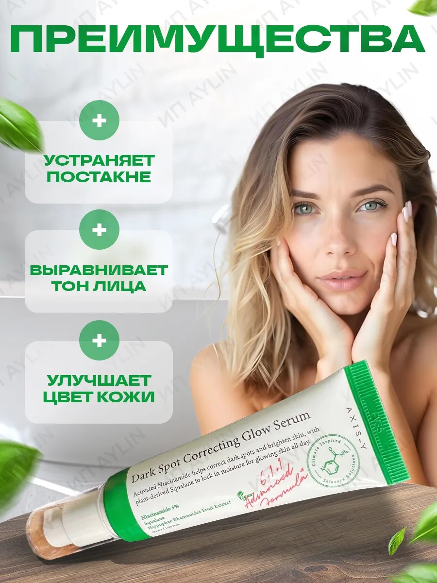 Dark spot correcting glow serum Axis-y обеспечивает выравнивание тона кожи лица. Сыворотка от пигментных пятен на лице это корейский трендовый уход. Сыворотка Axis y придает осветление кожи. Средство от пигментных пятен это идеальный серум для лица.