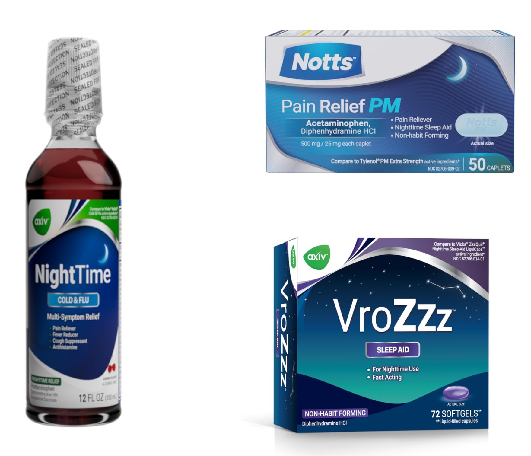 Convenient Value Bundle: This bundle combines three adult-use products in one package, offering clearly identified ingredients, multiple product formats, and everyday convenience. Softgel Formulation: AXIV VroZzz softgels contain Diphenhydramine HCl in liquid-filled softgels and are intended for adult use as directed on the product label. Ingredient Transparency: NOTTS PM caplets contain Acetaminophen 500 mg and Diphenhydramine HCl 25 mg per caplet, presented in a 50-count bottle with clearly labeled dosage information. NIGHTTIME FORMULA: Designed to support nighttime comfort and rest when occasional discomfort, congestion, or minor aches interfere with sleep. AXIV DayTime provides fast, maximum-strength relief for common daytime discomforts as directed. Clearly Labeled Liquid Formula: AXIV Liquid Formula is provided in a cherry-flavored liquid format with ingredient information clearly listed on the package for adult use according to label directions.
