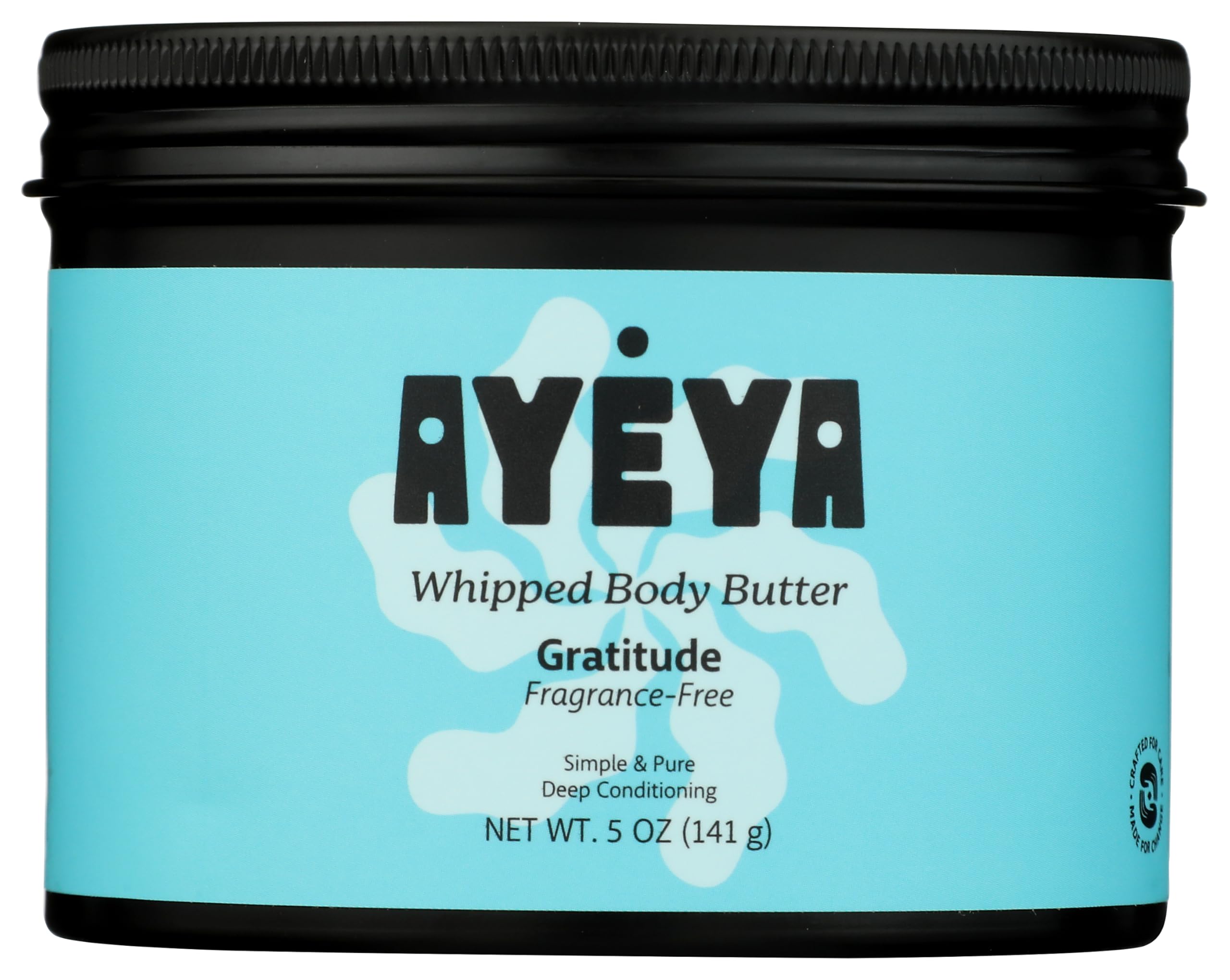 AYÉYA Gratitude is a gentle, fragrance-free whipped body butter created for those who value simplicity and skin sensitivity. Crafted with just two certified Fair-Trade ingredients—shea butter and coconut oil—this minimalist formula offers lasting hydration without added scent, essential oils, or synthetic additives. Its rich yet weightless texture melts effortlessly into the skin, offering deep nourishment and barrier support with zero irritation. Ideal for sensitive, reactive, or allergy-prone skin, Gratitude is especially suitable for use on delicate areas, post-shave zones, and anyone looking for ultra-clean hydration. Handmade in Ghana with heritage shea butter, it's the embodiment of purity, ethical craftsmanship, and skin-loving nourishment.Handmade in Ghana Using Traditional Techniques: Each jar is handcrafted in small batches using shea butter produced by women-led cooperatives in Ghana. This product supports fair wages, ethical labor, and centuries-old shea blending traditions, ensuring every purchase contributes to community empowerment and cultural preservation. Vegan, Non-Toxic, and Made Without Palm Oil: This clean body butter is made without parabens, sulfates, silicones, palm oil, or synthetic chemicals. It's a go-to product for anyone seeking plant-based skincare that supports skin health without compromising on integrity or effectiveness. Rich Texture That Absorbs Without Greess: Although deeply moisturizing, the whipped texture of Gratitude is light and non-comedogenic. It melts instantly into the skin, leaving a soft, nourished finish that won't clog pores or leave behind any sticky residue. Pure, Fragrance-Free Hydration That Calms and Conditions: This unscented body butter delivers lasting hydration without irritation. Its clean formulation is suitable for both face and body, and works beautifully for post-shave care, irritated areas, or anyone recovering from over-exfoliation or medical skincare treatments. Minimalist Formula for Sensitive or Allergy-Prone Skin: Designed for ultra-sensitive skin, this two-ingredient formula contains only certified Fair-Trade shea butter and organic coconut oil. It's free from artificial fragrance, essential oils, dyes, and harsh preservatives, making it ideal for individuals with eczema, contact dermatitis, or fragrance sensitivities.