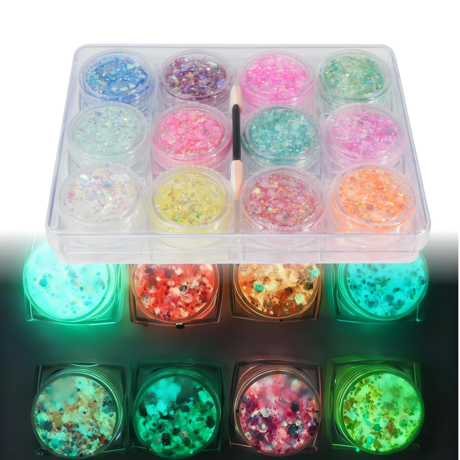 Add a touch of magic to your look with our festival face glitter. This set of 12 fluorescent colors is perfect for neon makeup and special occasions. Easy to apply and made with safe materials, these face glitter gels offer a luminous effect after exposure to light. Whether you want to shine at a concert or stand out at Halloween, these glitters are your ideal ally for a bold and festive style.Versatile Use: Whether for everyday neon makeup, music festivals, Halloween, or weddings, these glitters add a festive touch to any occasion. Ideal for embellishing various parts of the body and increg your visibility. Simplified Application: No glue needed! Easily apply the face glitter to your face, hair, or body with a cotton swab. For quick removal, simply use clean water or damp wipes. Safe and Comfortable: Made from non-toxic materials, these face glitter gels are gentle on the skin and suitable for all skin types. Their lightweight, ultra-fine texture ensures optimal comfort throughout the day. Amazing Glow-in-the-Dark Effect: Enjoy a shimmering effect in the dark by exposing the face glitter to ultraviolet light or sunlight. After 15 to 25 minutes of exposure, they absorb light for a striking glow, perfect for turning heads. Dazzling Colors: Discover our set of 12 festival face glitters, carefully individually wrapped. Each glitter offers a unique sparkle, ideal for neon makeup at festivals or special events.12 Couleurs Lumineuse Paillettes Gel, Couleurs Fluorescentes pour Maquillage Fluo, Gel Paillettes Visage Sûr et Facile à Appliquer, Effet LuminescentDESCRIPTION DU PRODUIT Ajoutez une touche de magie à votre look avec nos paillettes visage festival. Cet ensemble de 12 couleurs fluorescentes est parfait pour le maquillage fluo et les occasions spéciales. Faciles à appliquer et fabriquées avec des matériaux sûrs, ces gel paillettes visage offrent un effet lumineux après exposition à la lumière. Que vous souhaitiez briller lors d'un concert ou vous démarquer à Halloween, ces paillettes sont votre allié idéal pour un style audacieux et festif.Polyvalence d'Utilisation : Que ce soit pour un maquillage fluo quotidien, des festivals de musique, Halloween ou des mariages, ces paillettes ajoutent une touche festive à n'importe quelle occasion. Idéales pour embellir diverses parties du corps et augmenter votre visibilité. Application Simplifiée : Pas besoin de colle ! Appliquez facilement les paillettes visage sur votre visage, vos cheveux ou votre corps avec un coton-tige. Pour un démaquillage rapide, il suffit d'utiliser de l'eau claire ou des lingettes humides. Sûr et Confortable : Conçues à partir de matériaux non toxiques, ces gel paillettes visage sont douces pour la peau et adaptées à tous les types de peau. Leur texture légère et ultra-fine garantit un confort optimal tout au long de la journée. Effet Luminescent Étonnant : Profitez d'un effet brillant dans l'obscurité en exposant les paillettes visage à la lumière ultraviolette ou au soleil. Après 15 à 25 minutes d'exposition, elles absorbent la lumière pour un éclat saisissant, parfait pour attirer tous les regards. Couleurs Éblouissantes : Découvrez notre ensemble de 12 paillettes visage festival, soigneusement emballées individuellement. Chaque paillette offre une brillance unique, idéale pour un maquillage fluo lors de festivals ou d'événements spéciaux.