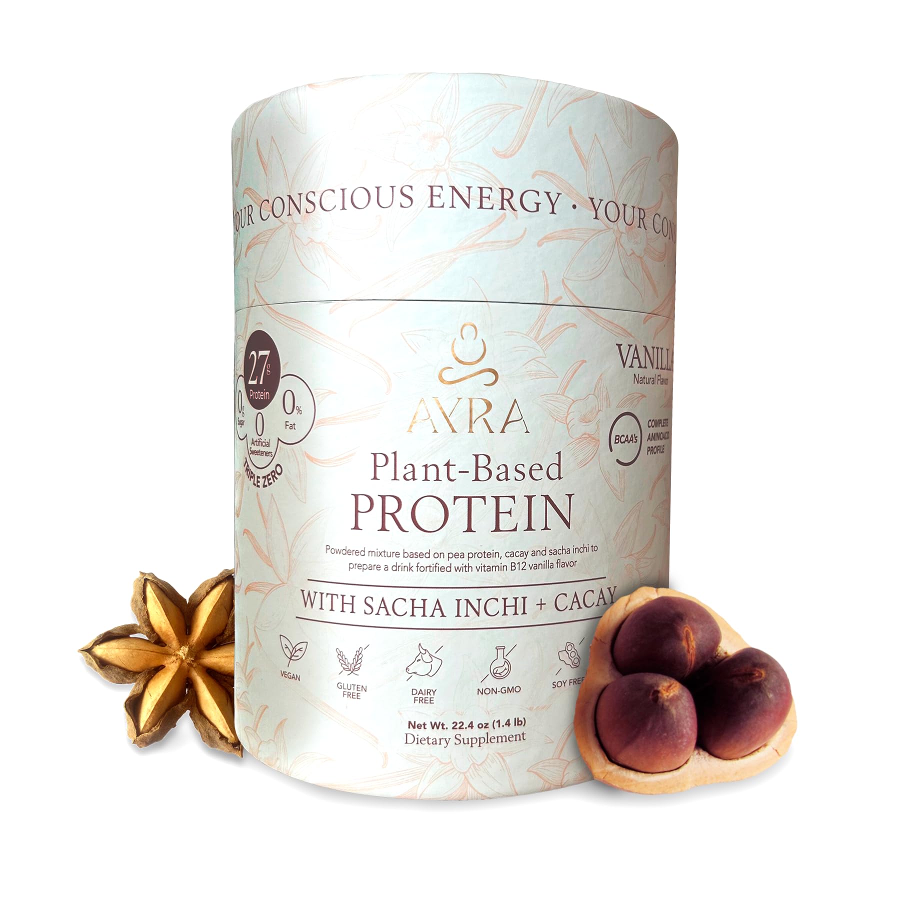 AYRA Plant Based VANILLA- natural flavor Protein WITH SACHA INCHIN AND CACAY 100 Plant-Based Complete Protein Powder. Naturally contains the 9 Essentials. Branched Chain Amino Acids (BCAA) L-arginine, Fiber, Omegas, and Calcium. Made from sustainably sourced, natural ingredients: Sacha Inchi, Cacay and Pea Protein. It is the perfect way to maintain and build lean muscle, support bone health, boost body structure, and increase strength, power, and endurance. With this incredibly versatile and easy-to-prepare blend, including enough clean, high-quality protein in your meals has never been easier and tastier. It will help you reach your fitness goals through the post-workout recovery or fuel your body with a nutrient-dense, high-protein source whenever needed. It can be easily incorporated into various foods and beverages: Mix it with water or plant-based milk to have a 30-second preparation in those busy days. Or you can add it to your favorite smoothies, yogurt, oatmeal, or baked groceries. Creativity is limitless. Its irresistible flavor and smooth texture will make you crave more!NO gums, preservatives, thickeners, additives, artificial flavoring, or refined sugar added. Gluten-free, Dairy free, Soy free, GMO Free. MAY HELP YOU: Develop and recover muscles, tissues, and bones Improve endurance and physical performance Aid in muscle growth Increase energy and vitality Prevent physical and mental fatigue Generate a feeling of satiety help in appetite control Improve intestinal transit Reduce the risk of cardiovascular diseases Strengthen the immune system. EASY TO INCORPORATE: Mix it with water or plant-based milk to have a 30-second preparation on those busy days. Or you can add it to your favorite smoothies, yogurt, oatmeal, or baked groceries. Creativity is limitless. MADE FROM SUSTAINABLE SOURCES AND NATURAL INGREDIENTS: Sacha Inchi, Cacay and Pea Protein. It is the perfect way to maintain and build lean muscle and support your bone health, boost your body structure, and increase your strength, power and endurance. AYRA: 100 Plant-Based Complete Protein (27g) Powder. Naturally, it contains the nine essentials. Branched Chain Amino Acids (BCAA's) L-arginine, Fiber, Omegas, and Calcium.