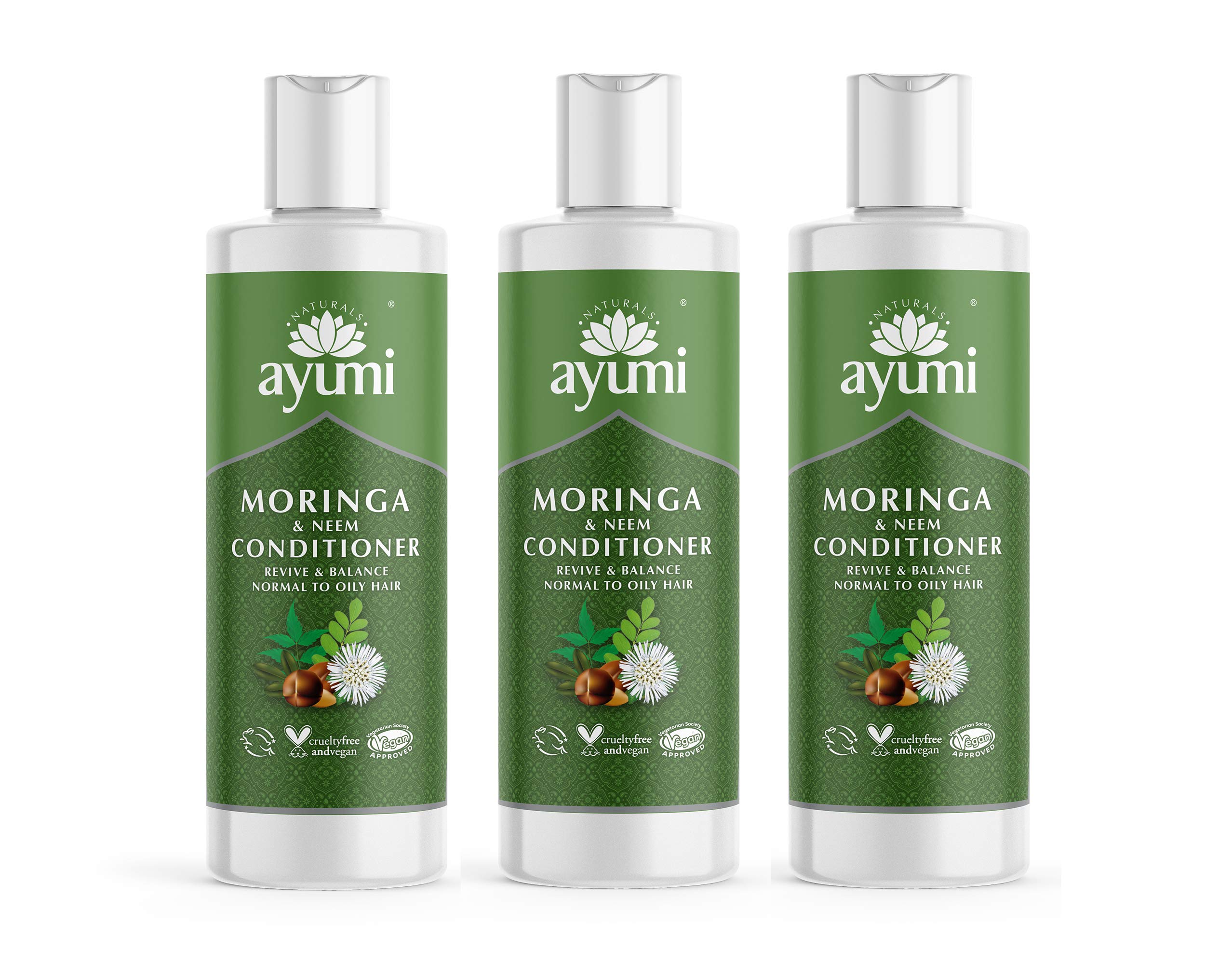 Four Conditioners Target Oily or Thick Hair to Keep It in Balance and Harmony.A blend of caring traditional Indian Botanicals of Shikakai, Aritha, Amla, Bhringraj, Neem, Tea Tree and Java Root Help Revive A Balanced Condition with Enhanced Lustre and Control.Oils of Argan, Coconut, Pumpkin, Neem, Moringa and Tea Tee Tree Work with the Natural Oils in The Hair to Give the Perfect Shine and Lustrre Instructions Apply to Wet Hair After Shampooing, Comb Through and Leave for 5 Minutes and then Rinse.A small amount can be applied to dry hair to conceal split ends and aid styling.Dermatologicalally tested vegan.We do not test Our Products on Animals.Oils of Argan, Coconut, Pumpkin, Neem, Moringa and Tea Tee Tree Work with the Natural Oils in The Hair to Give the Perfect Shine and Lustr.A blend of caring traditional Indian Botanicals of Shikakai, Aritha, Amla, Bhringraj, Neem, Tea Tree and Java Root Help Revive A Balanced Condition with Enhanced Lustre and Control.Four Conditioners Target Oily or Thick Hair to Keep It in Balance and Harmony.Four conditioners target oily or thick hair to keep it in balance and harmony. A blend of caring traditional Indian botanicals of Shikakai, Aritha, Amla, Bhringraj, Neem, Tea Tree and Java root help revive a balanced condition with enhanced lustre and control. Oils of Argan, Coconut, Pumpkin, Neem, Moringa and Tea Tree work with the natural oils in the hair to give the perfect shine and lustre GEBRAUCHSANWEISUNG Apply to wet hair after shampooing, comb through and leave for 5 minutes and then rinse. A small amount can be applied to dry hair to conceal split ends and aid styling.Dermatologically Tested Vegan. We do not test our products on animals. Oils of Argan, Coconut, Pumpkin, Neem, Moringa and Tea Tree work with the natural oils in the hair to give the perfect shine and lustre. A blend of caring traditional Indian botanicals of Shikakai, Aritha, Amla, Bhringraj, Neem, Tea Tree and Java root help revive a balanced condition with enhanced lustre and control. Four conditioners target oily or thick hair to keep it in balance and harmony.Ayumi Moringa Neem Conditioner. Vegan, Cruelty-Free, Dermatologically-Tested, 3 x 250ml