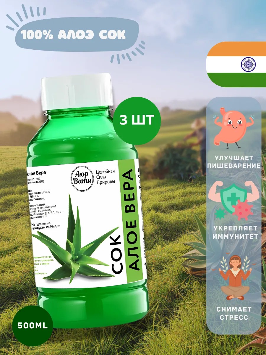 Ayurvati Алоэ вера 99%, натуральный питьевой сок, 500 мл 3 шт