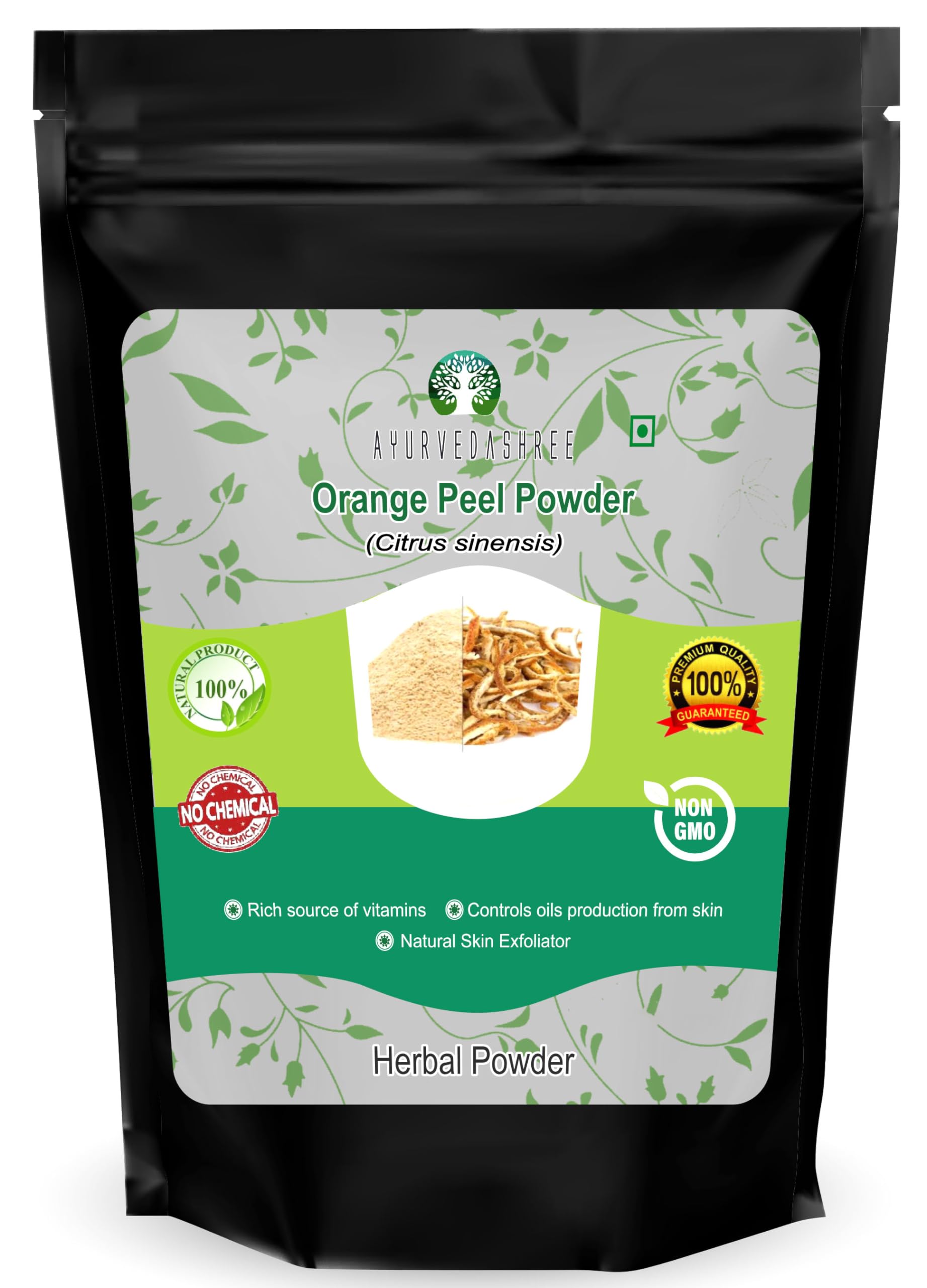 AYURVEDASHREE Orange Peel Powder 100 Gm. Our Orange Peel Powder is well known as Citrus sinensis. It is 100 pure and is extracted from dried orange peels. Considered as a blessing for face and skin care. Orange peel powder is bright, shiny and tangerine, the peel of the orange contains useful contains and using it regularly in face packs will give you clear and brighter skin in no time. Orange peel powder is made by grinding dried orange peel to the powder. Orange peel contains higher levels of vitamin c and it is a very effective ingredient to use in your beauty routine. It acts as an effective astringent, tightening skin pores, toning the skin and making the skin smoother.