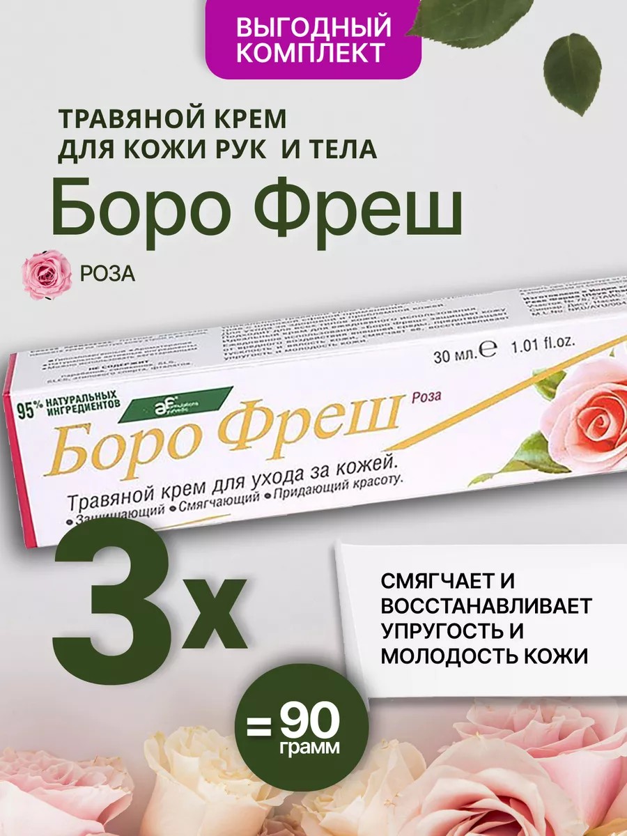 Травяной крем с активными натуральными компонентами и ароматом розы бережно ухаживает за кожей. Содержит в составе 95 % натуральных компонентов. Уникальный травяной крем из экстрактов натуральных трав с широкой сферой применения. Для ухода за здоровой и проблемной кожей. Подходит для всех типов кожи. Идеальный крем для ежедневного использования. Ежедневное использование «Боро Фреш» защищает кожу от вредного воздействия внешней среды, предотвращает тусклость и вялость кожи, смягчает её, восстанавливает упругость и молодость кожи.