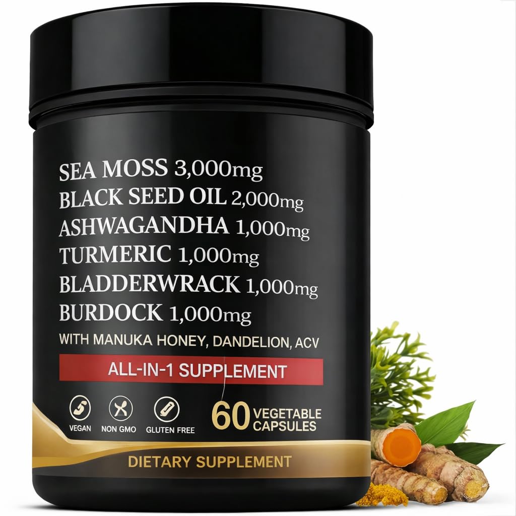 USA-Made, Premium Quality Dietary Supplement: Sea moss, apple cider vinegar capsules, ashwagandha supplements, honey powder, and other pure plants and herbs are used to create our sophisticated herbal complex. Made in a facility that is FDA-registered and GMP-certified, these dietary pills are free of harmful fillers, gluten, and are vegan. created to offer optimal purity and absorption for your healthy way of life. Age-Defying Wellness, Skin, and Hair: These black seed oil capsules, which are filled with Irish sea moss, manuka honey, and honey extract, support the improvement of cellular life while nourishing skin, hair, and nails. This herbal wellness complex offers vital nutra superfoods for graceful aging, promotes natural bloom and a healthy glow, and helps calm the body. Support for Body Cleanse Immune Booster: This blend functions as a natural detox and cleanse supplement with sea moss bladderwrack, bladderwrack herb, dried burdock root, and ACV capsules. Packed with vital minerals, herbs, and superfood extracts, it promotes immunity, digestive health, and balanced bodily functions. A natural daily system-strengthening method. Men and Women's Energy, Concentration, and Stress Reduction: This combination of black seed extract, turmeric powder, and ashwagandha extra strength is designed as an advanced energy supplements that supports focus, increases energy, and manages stress. Perfect as supplements for women and men seeking natural energy boosts, metabolism support, and stress relief without artificial additives. All-in-One Multimineral Sea Moss Supplement: Burdock root capsules, turmeric with black pepper, sea moss ashwagandha black seed oil, and dandelion root extract are all combined in our potent True Sea Moss complex. This all in one sea moss supplement provides a variety of minerals, vitamins, and nutrients in easy-to-take sea moss pills that promote general health, vitality, and wellness.