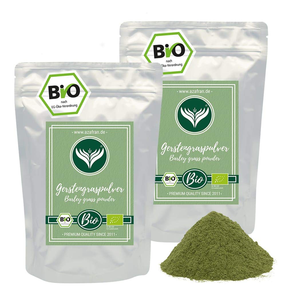 Packed in the recoverable aroma bag A 250kg!Control point: DE-ÖKO-009.Without the addition of flavor enhancers and artificial flavors.And finally one of our favorite tips . Stir barge and flax seeds in curd cheese or cream cheese and you already have a delicious dip with bread or potatoes.Preparation recommendation: Mix 1 teaspoon of barley grass in a fruit juice or smoothie.A mixture with fruit juice alleviates the powder's own taste.Attention: barley grass smells and tastes of grass and can initially take some getting used to.A popular composition is also barley grass with turmeric, for example, this mixture harmonizes perfectly with a plant drink and thus makes it a perfect addition to vegan or vegetarian nutrition.Versatile, varied, healthy . No matter whether muesli, porridge or power drink . hardly any creations to be topped with little effort, let your creativity run free.Why not try a Gertgras shot with gingerLet yourself be inspired in terms of taste.Like many other types of grain, barley belongs to the family of sweet grass.From a biological point of view, Gerstengrass is the young barley plant.If you plant a barley grain, it does not take long for an inconspicuous halt to sprout.As simple as this stalks also looks, hardly any other food can take in with it.Because this small stalks contains an incredible combination of ingredients.Healthy Lifestyle isn't a foreign word for youConscious diet is a matter of the heart for youThen you are exactly right with our barley grass powder.100 pure barley grass powder, a remarkable nutrient density and a soothing taste make it the perfect superfood.Our barley grass powder comes from organic cultivation in Germany or Austria and is one of the classics of superfoods.We provide you with a ""premium version"" that is rich in natural chlorophyll and other herbal micronutrients.Premium organic barley grass powder (1kg) from Azafran (English: Barley Grass Powder).Im wiederverschließbaren Aromabeutel a 250kg verpackt! Kontrollstelle: DE-ÖKO-009. Ohne Zusatz von Geschmacksverstärkern und künstlichen Aromen, unbestrahlt. Und zuletzt noch einer unserer Lieblingstips.rühren Sie Gerstengras und Leinsamen in Quark oder Frischkäse ein und schon haben Sie einen leckeren Dip zu Brot oder auch Kartoffeln. Zubereitungsempfehlung: Mischen Sie z.B. 1 TL Gerstengras in einem Fruchtsaft oder Smoothie. Eine Mischung mit Fruchtsaft mildert den Eigenschmack des Pulvers. Achtung: Gerstengras riecht und schmeckt nach Gras und kann anfangs gewöhnungsbedürftig sein. Eine beliebte Komposition ist auch Gerstengras mit Kurkuma, diese Mischung harmoniert zum Beispiel perfekt mit einem Pflanzendrink und macht es somit zu einer perfekten Ergänzung der veganen oder vegetarischen Ernährung. Vielseitig, abwechslungsreich, gesund.egal ob Müsli, Porridge oder Powerdrink.kaum zu toppende Kreationen mit wenig Aufwand, lassen Sie Ihrer Kreativität freien Lauf. Warum nicht mal einen Gertengras-Shot mit Ingwer probierenLassen Sie sich geschmacklich inspirieren. Gerste gehört, wie viele andere Getreidesorten auch, zur Familie der Süssgräser. Biologisch betrachtet handelt es sich bei Gerstengras um die junge Gerstenpflanze. Pflanzt man ein Gerstenkorn ein, dauert es nicht lange, bis daraus ein unscheinbarer Halm sprießt. So schlicht dieser Halm auch aussieht, so kann es kaum ein anderes Lebensmittel mit ihm aufnehmen. Denn dieser kleine Halm beinhaltet eine unglaubliche Kombination an Inhaltsstoffen. Healthy Lifestyle ist kein Fremdwort für SieBewusste Ernährung ist bei Ihnen HerzenssacheDann liegen Sie mit unserem Gerstengraspulver genau richtig. 100 reines Gerstengraspulver, eine bemerkenswerte Nährstoffdichte und ein wohltuender Geschmack machen es zum perfekten Superfood. Unser Gerstengras Pulver stammt aus biologischem Anbau in Deutschland oder Österreich und gehört zu den Klassikern der Superfoods. Wir liefern Ihnen dabei eine "Premiumversion", die reich an natürlichem Chlorophyll und anderen pflanzlichen Mikronährstoffen ist. Premium BIO Gerstengraspulver (1kg) von Azafran (Engl: barley grass powder).Azafran BIO Gerstengraspulver, Gerstengras Pulver aus natürlichen Anbau in DE oder AT 1kg 500 g (2er Pack)