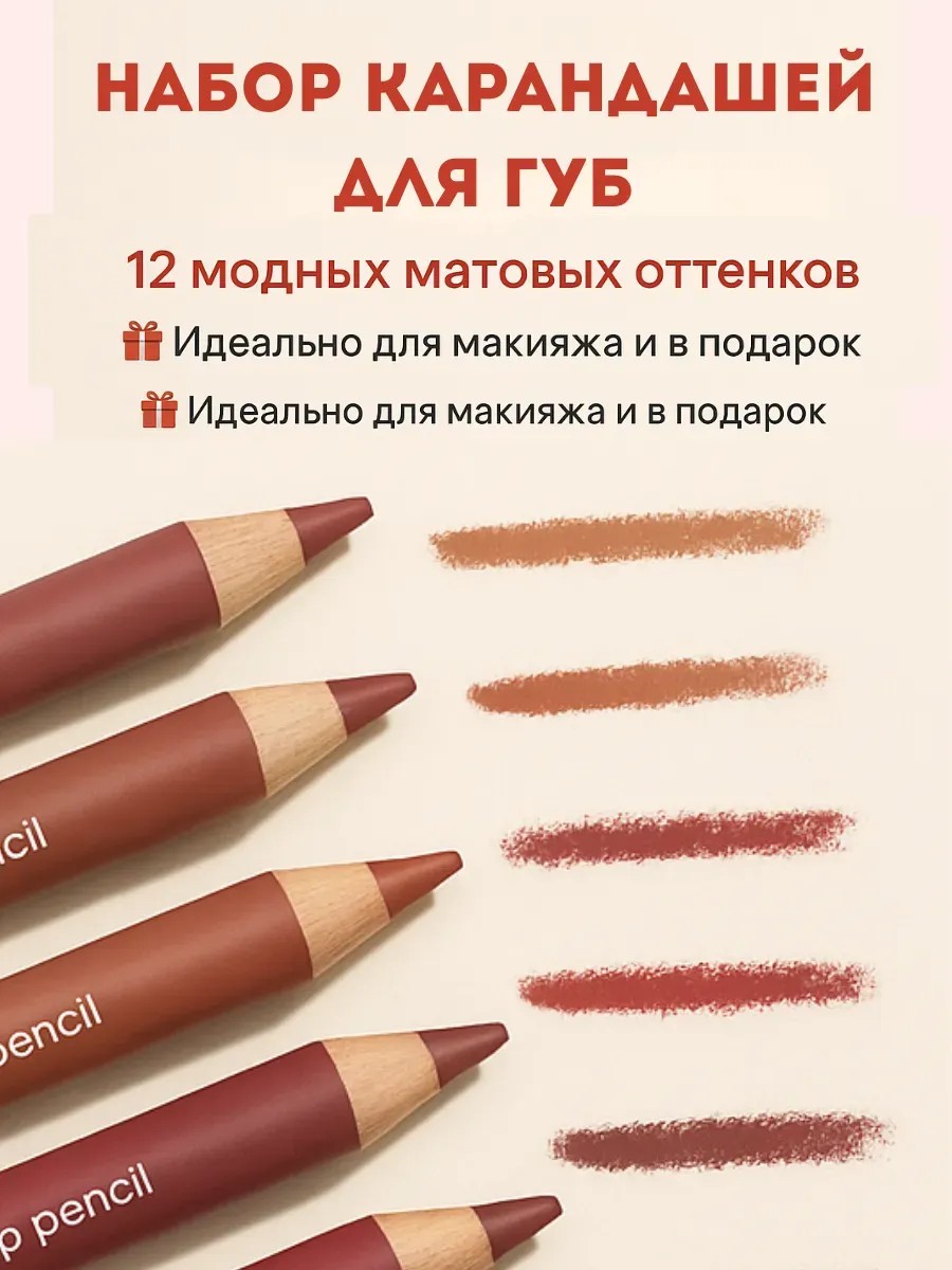 Создай идеальный контур губ с помощью набора матовых карандашей для губ! Палитра из 12 универсальных оттенков от нюдового до ягодного — твой must-have в косметичке. Мягкая текстура легко скользит по коже, обеспечивая плотное покрытие и стойкий цвет.