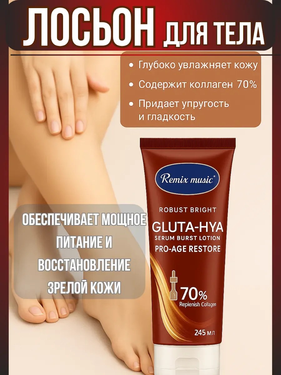 Эффективный уход за зрелой кожей начинается с глубокого увлажнения и питания. Антивозрастной лосьон Remix Music GLUTA-HYA Pro-Age Restore создан специально для восстановления тонуса кожи, повышения её упругости и уменьшения признаков старения. Формула с 70-кратным содержанием глутамина и обогащённая коллагеном оказывает заметный лифтинг-эффект, разглаживает морщины и придаёт коже эластичность и свежесть.