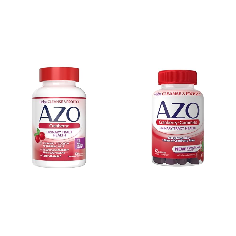 Convenient, easy to take cranberry softgels and tasty mixed berry gummies promote urinary health without extra sugar or calories. The cranberry softgels and gummies help maintain a healthy urinary tract with naturally sourced ingredients. Pacran, a super-concentrated whole fruit cranberry blend, helps flush the urinary tract in both the softgels and gummies. Take 2 AZO Cranberry gummies daily for the benefits of 1 glass of cranberry juice without the sugar (72 gummies per bottle). Get the urinary tract benefits of 1 glass of cranberry juice in just 1 serving of AZO Cranberry softgels (100 softgels per bottle).
