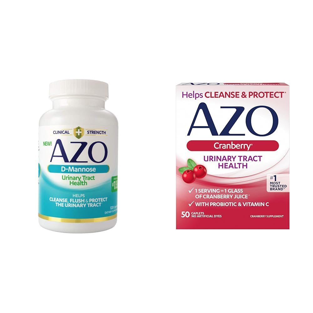 AZO D Mannose Urinary Tract Health, Cleanse, Flush Protect The Urinary Tract, No.1 Pharmacist Recommended Brand, Clinical Strength, Non-GMO, 120 Count AZO D-Mannose is made with clinical strength D-Mannose to help protect urinary health by helping to flush, cleanse and protect the urinary tract. These convenient, easy to swallow capsules are specifically formulated to help maintain a healthy urinary tract in women. These statements have not been evaluated by the Food and Drug Administration. This product is not intended to diagnose, treat, cure, or prevent any disease. This product is a dietary supplement and is not meant to treat, cure or prevent the following: Urinary Tract Infection, UTI or other urinary tract issues. AZO Cranberry Urinary Tract Health Supplement, 1 Serving 1 Glass of Cranberry Juice, Sugar Free Cranberry Pills, 50 Count Take AZO Cranberry Caplets as part of your daily routine to maintain a healthy urinary tract! Tired of drinking cranberry juice? Get the urinary tract benefits of one glass of cranberry juice in just 1 serving of AZO Cranberry caplets. These convenient, easy to swallow caplets are specifically formulated to help maintain a healthy urinary tract. AZO Cranberry is made with clinically proven Pacran, a super-concentrated whole fruit cranberry powder that helps flush to maintain urinary tract cleanliness.Product 2: MADE WITH PACRAN, a super-concentrated whole fruit cranberry powder that helps flush the urinary tract. Product 2: SUGAR FREE. AZO Cranberry caplets are sugar free, whereas many cranberry juice cocktail brands have over 42 grams of sugar and 165 calories per 12 ounce serving. AZO Cranberry products are gluten-free. Product 2: URINARY TRACT BENEFITS OF ONE GLASS OF CRANBERRY JUICE in just 1 serving of AZO Cranberry Pills. Product 2: MAINTAIN A HEALTHY URINARY TRACT. Taking AZO Cranberry Caplets as part of your daily routine can help maintain a healthy urinary tract health. Product 1: CONVENIENT, EASY TO SWALLOW CAPSULES: AZO D-Mannose is a daily, drug-free solution to help maintain a healthy urinary tract. . Product 1: CLINICAL STRENGTH SUPPORT: AZO D-Mannose is formulated with the same amount of D-Mannose used in scientific studies shown to promote urinary tract health. . Product 1: Product Note: Exposure to heat or sunlight may lead to melting damage of product. Hence customers are expected to be available during the product delivery. Product 1: CLEANSE, FLUSH, PROTECT THE URINARY TRACT: AZO D-Mannose helps flush the urinary tract to maintain cleanliness and help reduce bacteria adhesion. .
