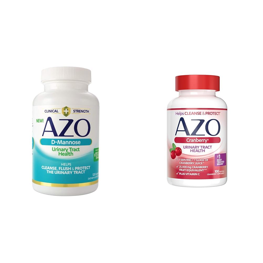 AZO D Mannose Urinary Tract Health, Cleanse, Flush Protect The Urinary Tract, No.1 Pharmacist Recommended Brand, Clinical Strength, Non-GMO, 120 Count AZO D-Mannose is made with clinical strength D-Mannose to help protect urinary health by helping to flush, cleanse and protect the urinary tract. These convenient, easy to swallow capsules are specifically formulated to help maintain a healthy urinary tract in women. These statements have not been evaluated by the Food and Drug Administration. This product is not intended to diagnose, treat, cure, or prevent any disease. This product is a dietary supplement and is not meant to treat, cure or prevent the following: Urinary Tract Infection, UTI or other urinary tract issues. AZO Cranberry Urinary Tract Health Supplement, 1 Serving 1 Glass of Cranberry Juice, Sugar Free Cranberry Pills, Non-GMO 100 Softgels "AZO Cranberry Softgels Take AZO Cranberry softgels as part of your daily routine to maintain a healthy urinary tract! Tired of drinking cranberry juice? Get the urinary tract benefits of one glass of cranberry juice in just 1 serving of AZO Cranberry softgels. These convenient, easy to swallow softgels are specifically formulated to help maintain a healthy urinary tract. AZO Cranberry is made with clinically proven Pacran, a super-concentrated whole fruit cranberry powder that helps flush to maintain urinary tract cleanliness."