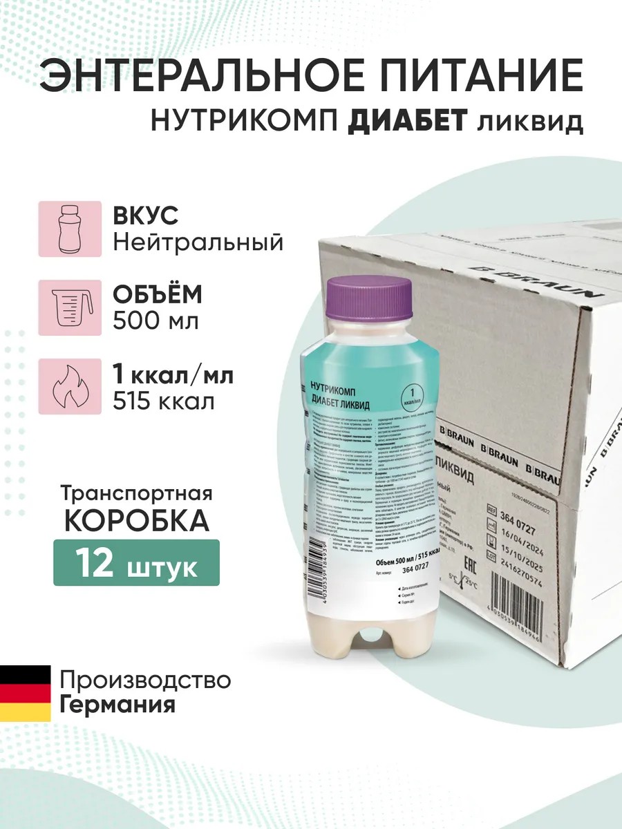 Энтеральное питание Нутрикомп Диабет ликвид - Специализированная смесь, обогащенная пищевыми волокнами, для пациентов с сахарным диабетом или сниженной толерантностью к глюкозе. Предназначена для перорального и зондового введения в качестве основного или дополнительного питания, может быть единственным источником питания при истощении организма, травмах, стрессорных гипергликемиях, осложнениях послеоперационного периода, инфекции ЦНС, онко- заболеваниях, коматозном состоянии, расстройстве жевательной и глотательной функции, интенсивных занятиях спортом, коррекции фигуры. Энергетическая ценность: 1 мл=1 ккал, содержит пребиотик (пищевые волокна 2,1г/100мл). Сочетание молочного и соевого протеинов обеспечивает максимально полноценный белковый состав. Углеводы представлены крахмалом. Жировой компонент представлен сбалансированной комбинацией подсолнечного, соевого, рапсового масел и рыбьего жира. Не содержит глютена, холестерина, лактозы, содержание пурина 3,0мг в 100 мл, Халяльный продукт. Приём методом парсинга, один флакон рассчитан на 1 день
