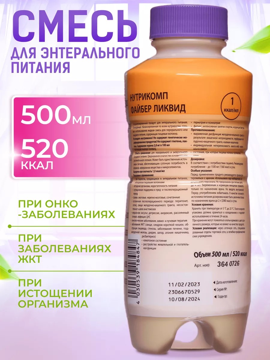 Nutricomp Fiber Liquid Enteral Nutrition 500 ml. Balanced enteral nutrition with dietary fiber. A complete, nutrient-rich, ready-to-use liquid formula with dietary fiber for patients with standard protein and energy requirements. It is intended for oral and tube use as a primary or additional nutrition in case of exhaustion of the body, as nutritional support in the pre- and postoperative period, for gastrointestinal diseases. The protein component is represented by easily digestible, biologically highly valuable milk proteins (60%) and soy (40%). The combination of soybean, rapeseed oils, MCT and fish oil provides an optimal ratio of PUFAs. Carbohydrates are represented by maltodextrin with a high content of polysaccharides. 1.5% dietary fiber (1.5 g / 100 ml). Distribution of energy value (% kcal): proteins: fats: carbohydrates: dietary fiber 15: 29: 53: 3. Does not contain gluten, cholesterol, lactose. Purine content 2.8 mg in 100 ml. for adults