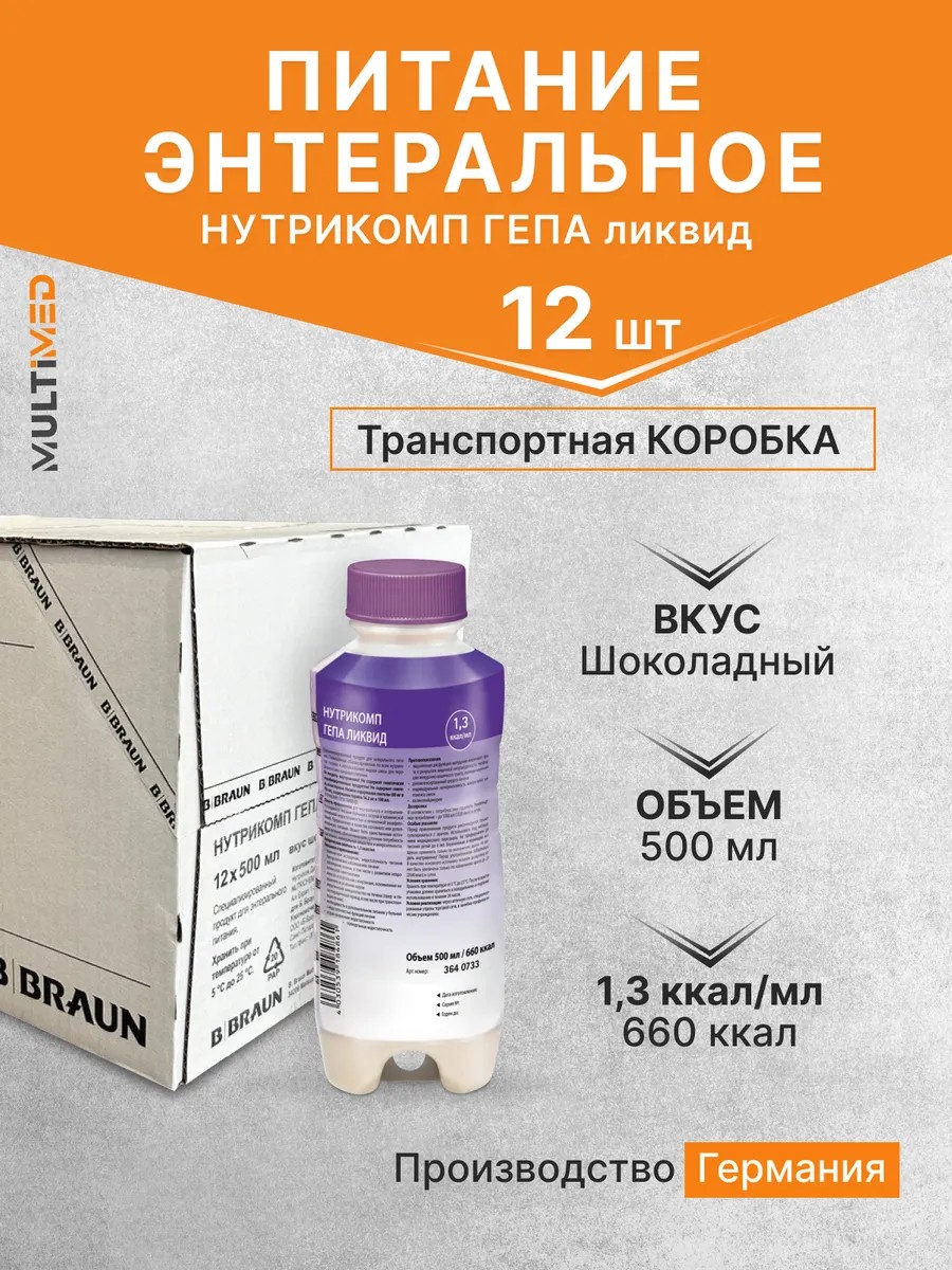 Nutricomp Hepa liquid is a complete, balanced in all nutrients, ready-to-use liquid mixture, taken in the classical way (by mouth) or with a tube. The liquid mixture can be used as a main or additional nutrition for patients with acute and chronic liver failure and hepatic encephalopathy. Nutricomp Hepa is able to provide the body with all the necessary vitamins, minerals and microelements, and therefore the mixture can be the only source of nutrition for a person. Composition characteristics: Special amino acid composition (milk protein and branched amino acids); Does not contain genetically modified products; Does not contain gluten, cholesterol; Low lactose content (80 mg in 100 ml); Purine content 54.2 mg in 100 ml. It is recommended to use the liquid mixture Nutricomp Energy liquid: Clinical exhaustion of the body, malnutrition in chronic liver diseases; Liver diseases, including those with the development of neurological symptoms; Cholestasis and portal hypertension complicated by impaired fat absorption; Surgical interventions on the liver (pre- and postoperative period, including liver transplantation); The need for additional nutrition in patients with liver failure; Acute liver failure; Multiple organ failure. Please note: Before using the product, consult a doctor; Should be used under the supervision of medical personnel; Prohibited for use by children under 4 years of age! Pregnant and lactating women can use only as prescribed by a doctor; Shake the package before use; If the liquid mixture is used as the main source of nutrition, its dosage can be increased, only as prescribed by the attending physician, up to two liters (2640 kcal) per day. When Nutricomp Energy mixtures are contraindicated: Severe gastrointestinal dysfunction due to intestinal obstruction, gastrointestinal perforation, or intestinal ischemia; Individual intolerance to any component of the liquid mixture; Valinoleucinuria. Storage conditions: Store at temperatures between 5 and 25°C. After opening, the mixture should be refrigerated and used within 24 hours.
