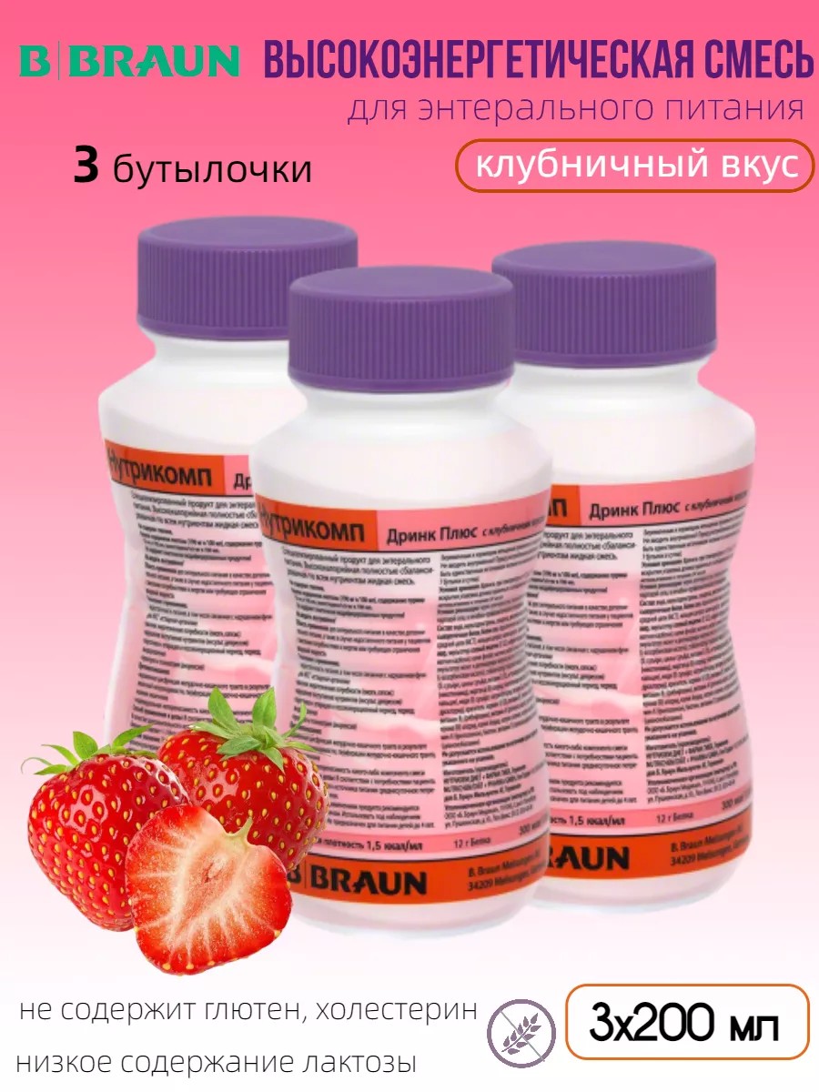 Нутрикомп Дринк плюс — это специализированная полноценная высокоэнергетическая (1,5 ккал/мл) смесь без пищевых волокон, без глютена, с очень низким содержанием лактозы. Вкус: клубника.