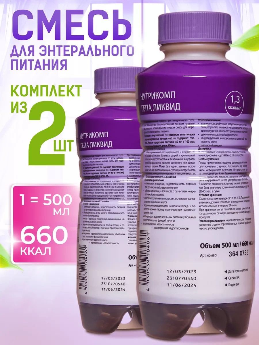 Nutricomp Hepa Liquid Enteral Nutrition Set 500 ml. x 2 pcs. Chocolate. A specialized, ready-to-use liquid mixture with chocolate flavor and high energy content, enriched with dietary fiber, for patients with acute and chronic liver failure. Indications for use: clinical exhaustion, malnutrition in chronic liver diseases, cholestasis and portal hypertension complicated by impaired fat absorption, liver surgery (including liver transplantation), the need for additional nutrition in patients with liver failure, acute liver or multiple organ failure. Energy value: 1 ml - 1.3 kcal. The fat component is represented by a combination of MCT and soybean oil. Increased content of branched and decreased content of aromatic amino acids. Carbohydrates are represented by maltodextrin with a high content of polysaccharides. Gluten free, cholesterol free, Halal product.