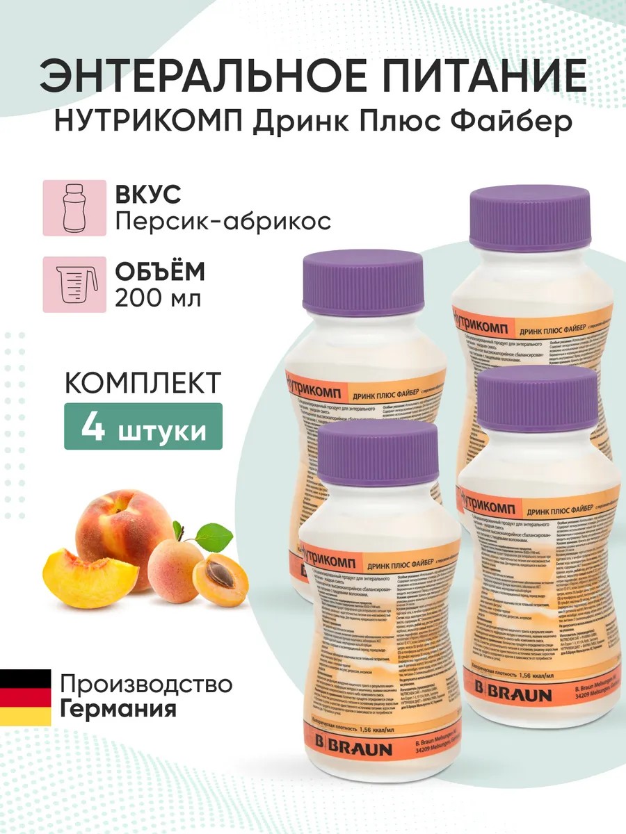 Энтеральное Нутрикомп Дринк Плюс Файбер вкус персик-абрикос - Полноценная сбалансированная высокоэнергетическая смесь для дополнительного перорального питания с пищевыми волокнам и МСТ, без глютена, с крайне низким содержанием лактозы. Предназначена при истощении или недостаточности питания, связанными с заболеваниями, или невозможностью самостоятельного приема пищи. Для пациентов с повышенными энергетическими потребностями, с нарушением функции ЖКТ (например, рак, ВИЧ/СПИД, синдром короткой кишки, воспалительными заболеваниями кишечника в стадии ремиссии, кишечные свищи), при некупируемой мальабсорбции, как подготовка к операции и в послеоперационный период, период выздоровления, при дисфагии, нарушении поступления нутриентов (инсульт, депрессия), неврология (анорексия). Высокая энергетическая ценность (156 ккал / 100 мл), высокая биологическая ценность белка (молочный и соевый), увеличенное количеством МСТ (2,5г/100мл), омега-3 жирные кислоты рыбьего жира (0,21г/100мл EPA и DHA). Халяльный продукт.