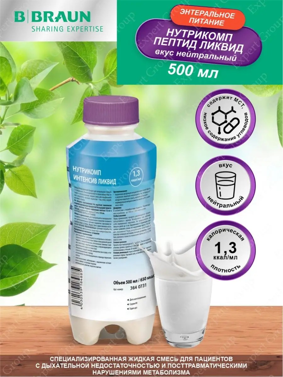 Enteral nutrition Nutricomp Intensive liquid 500 ml. A specialized hypercaloric, ready-to-use liquid mixture with a low carbohydrate content, enriched with MCT. Metabolically adapted formula for patients with respiratory failure and post-traumatic metabolic disorders. Intended for oral and tube administration as primary or additional nutrition, it can be the only source of nutrition for patients with post-traumatic metabolic disorders, respiratory failure, cancer, chemo- and radiation therapy, with contraindications to the use of dietary fiber. Energy value of 1 ml is 1.3 kcal. The high biological value of protein is due to a combination of milk and soy proteins. Carbohydrates are represented by maltodextrin with a high content of polysaccharides. The fat component is represented by a combination of MCT and soybean oil. Low physiological osmolarity ensures better tolerability of the mixture. Halal product.