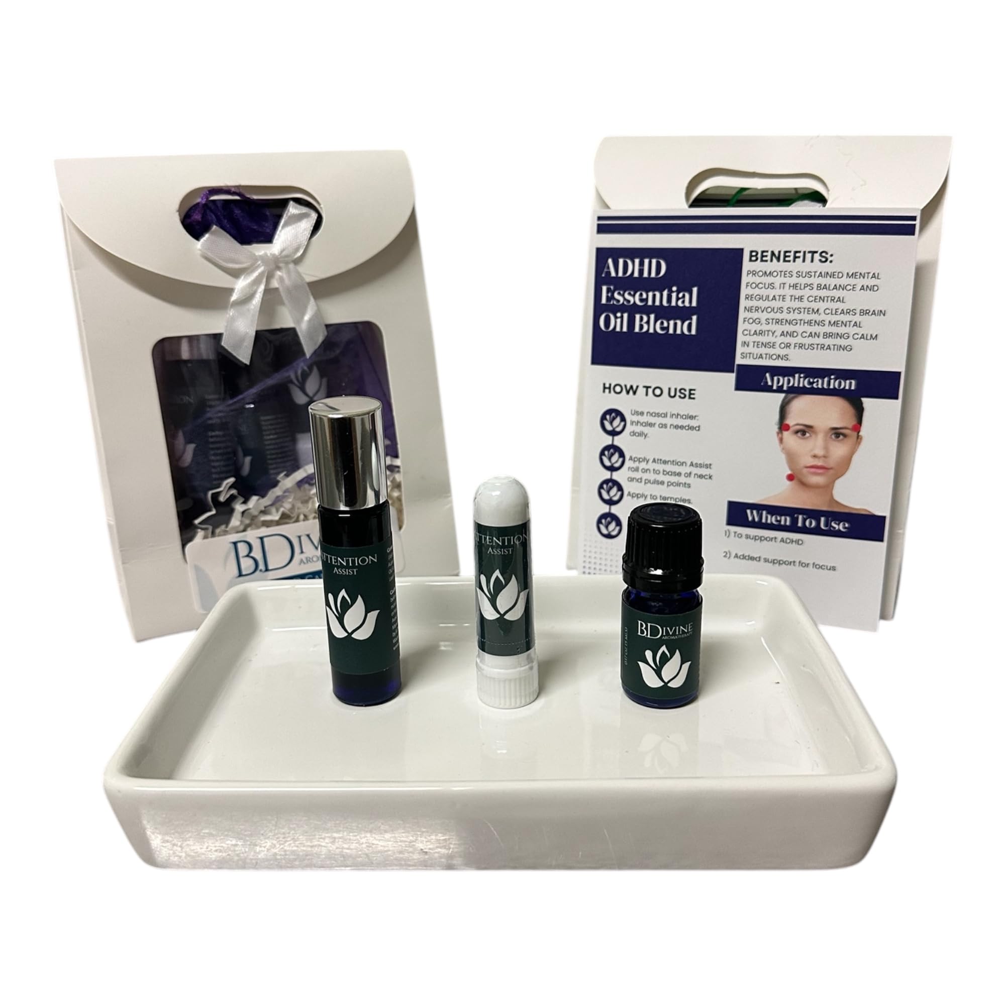 B Divine Aromatherapy Attention Assist Care Kit with Organic Essential Oils. Nasal Inhaler roll-on and Diffuser Blends.