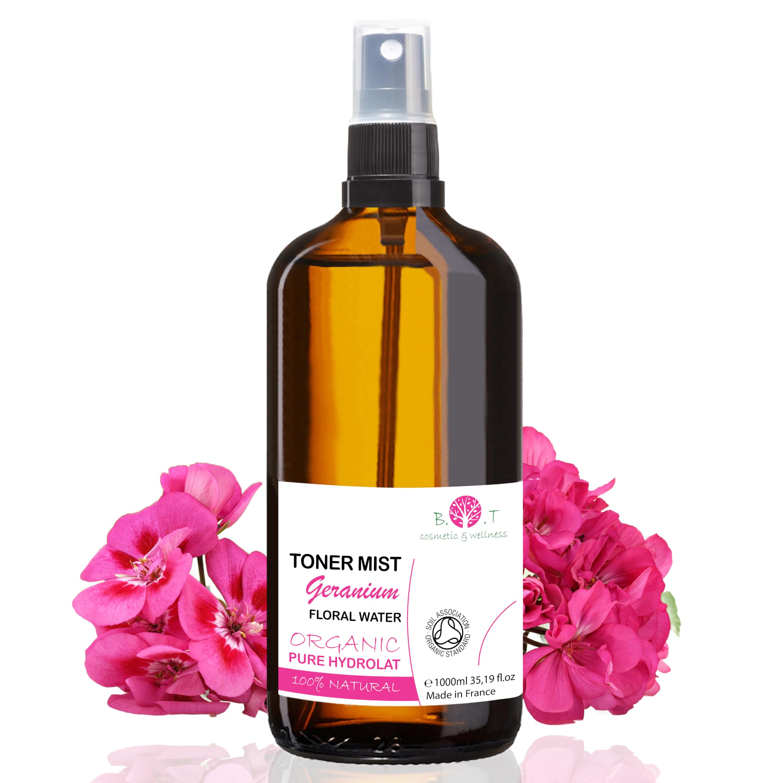 B.O.T cosmetic wellness Bio Hydrolat de Géranium. Eau de Géranium pour les Soins de la Peau (Visage Corps), les Cheveux et la Maison. Tonique pour le Visage 100 Naturel Pur - 1000 ml