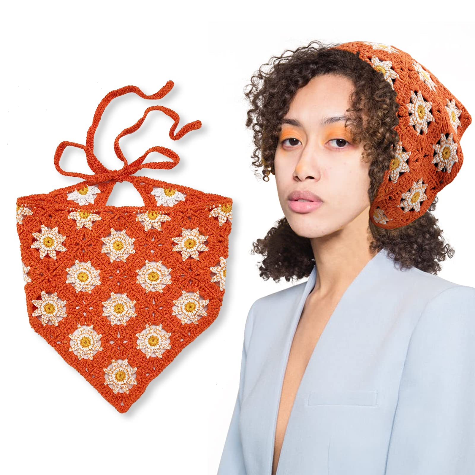 B.PHNE Floral Hair Scarf For Women - Floral Crochet Hair Bandanas Headscarf For Girl Cute Boho Headbands Hair Scarf Daisy Headband Vintage Head Kerchief for Girls (Orange) color 1