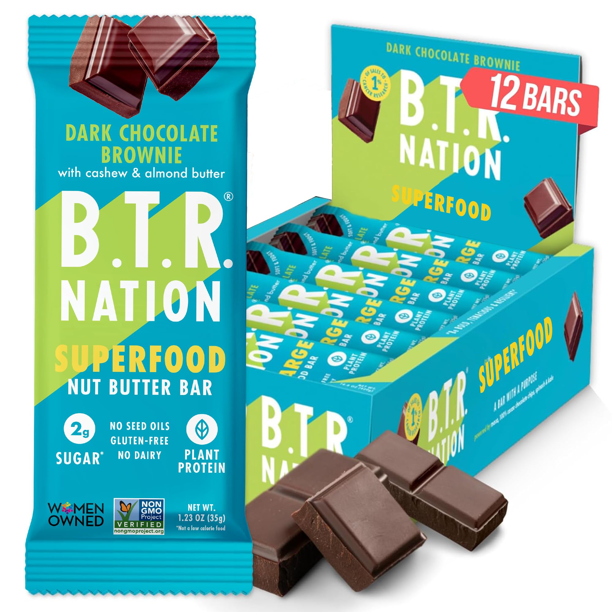 ✓ BEYOND THE BAR: We're on a mission to end mindless snacking for good. 100 women-owned, mission-driven, we created B.T.R. Bars to help you snack better, feel better, and be BOLD, TENACIOUS RESILIENT! Because we see YOU. On the move. Doing it all. Isn't it time you had a snack that did it all too?. ✓ UNPARALLELED TASTE TEXTURE: Tastes like dark chocolate a fudge brownie had a baby! Dense and fudgy, never chalky and doesn't stick to your teeth like other protein bars. The dark chocolate chips simply melt in your mouth! Go ahead, indulge guilt-free. It's the best keto brownie bar. ✓ NO JUNK, EVER. WE PROMISE: B.T.R. Bars are Non-GMO, Gluten-Free, Dairy-Free, and Soy-Free with a 100 Clean Label. No sugar alcohols, no stevia, no gums or emulsifiers, and no flavors (not even so-called "natural flavors"). ✓ 90 LESS SUGAR THAN THE AVERAGE PROTEIN BAR: B.T.R. Bars are paleo keto protein bars, with no added sugar or artificial sweeteners. Only 2g of total sugar, 4g of net carbs. The perfect keto bar: a low carb snack food, perfect for your keto diet!. ✓ PLANT-BASED SUPERFOODS TO FUEL YOUR AM - PM: B.T.R. Bars are the first Protein Bars with a Purpose. Powered by MCT Oil from pure coconut, maca, spinach, kale, cocoa powder more vegan superfoods to help you stay sharp. Each RECHARGE Bar contains 7g of plant-based protein, prebiotic fiber, and 170 calories to keep you full and satisfied!.