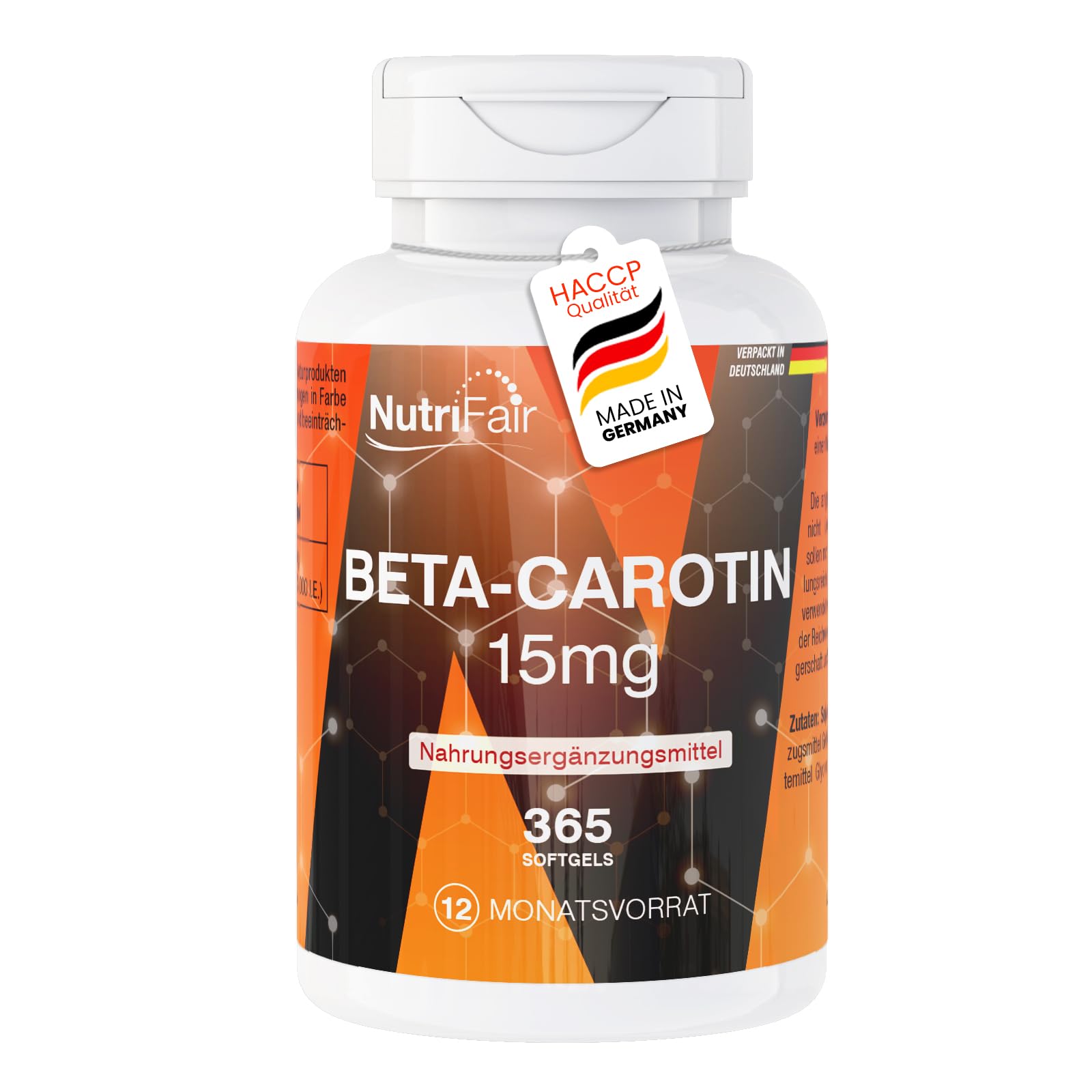 Bêta-carotène - 365 gélules - 15mg par gélule - équivalent à 25.000 UI - Hautement dosé - Production allemande et testé en laboratoire - NutriFair Premium Fair