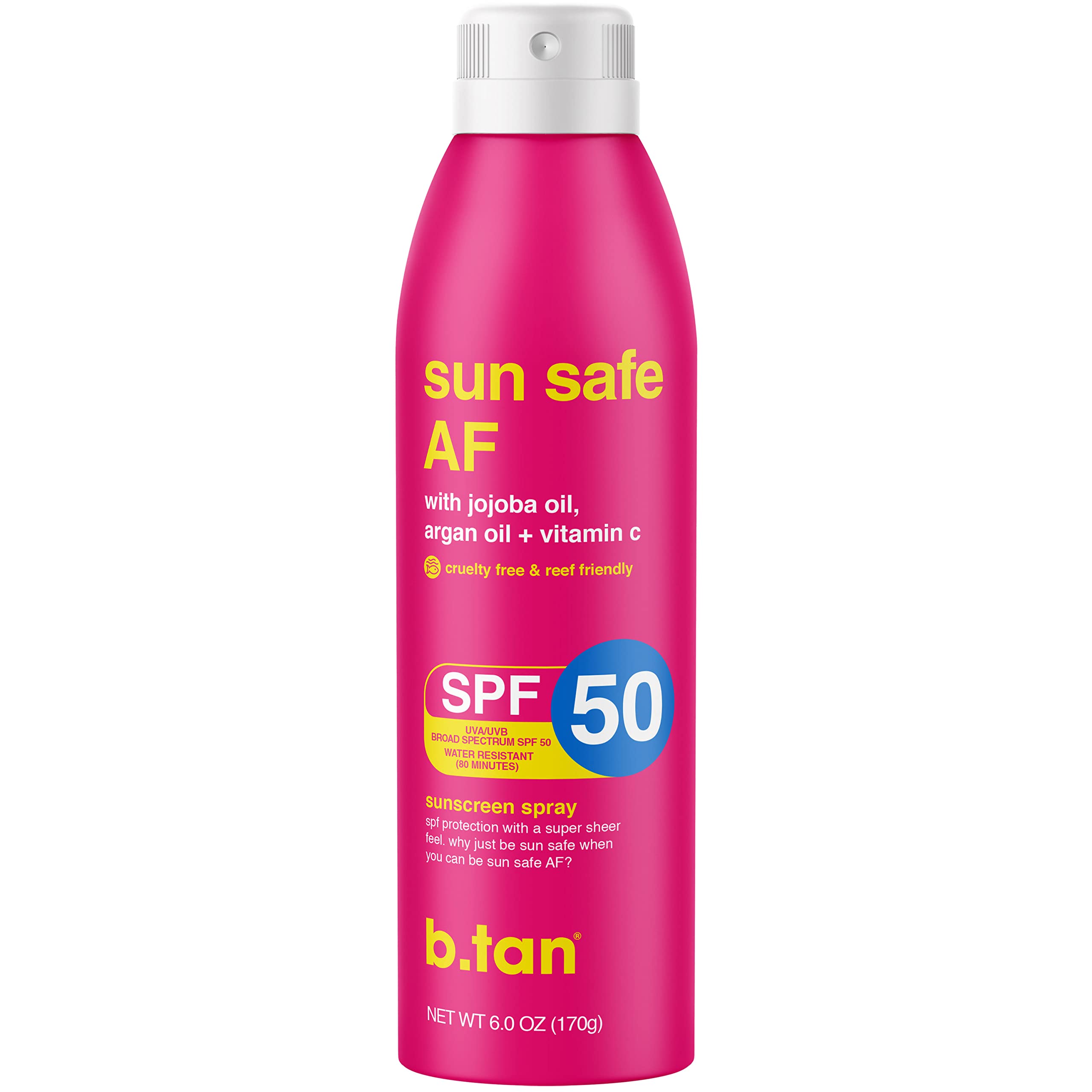 b.tan Sunscreen Spray SPF 50 | Sun Safe AF Body Spray - Weightless & Quick Absorbing for a Super Sheer Feel Hydrating & Silky AF From Vitamin C Jojoba + Argan Oil Reef Friendly Vegan Cruelty Free 7 Fl Oz
