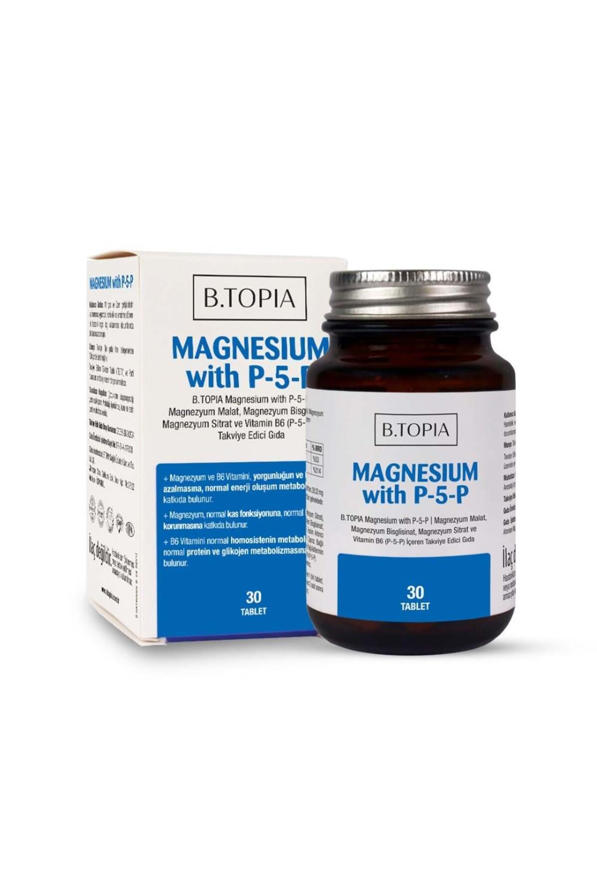 B.TOPIA Magnesium with P-5-P Supplementary Food Containing Magnesium Malate, Magnesium Bisglycinate, Magnesium Citrate and Vitamin B6 (P-5-P). B.TOPIA Magnesium with P-5-P is a food supplement in tablet form containing magnesium malate, magnesium bisglycinate, magnesium citrate, and vitamin B6 (P-5-P). One capsule of B.TOPIA Magnesium with P-5-P contains a total of 200 mg of magnesium, consisting of 100 mg of magnesium citrate, 50 mg of magnesium malate, 28.32 mg of magnesium bisglycinate, and 21.68 mg of magnesium oxide, along with P-5-P, the active form of vitamin B6. It is formulated with vitamins and minerals of European origin. B.TOPIA Magnesium with P-5-P does not contain gluten, lactose, dyes, or sweeteners.