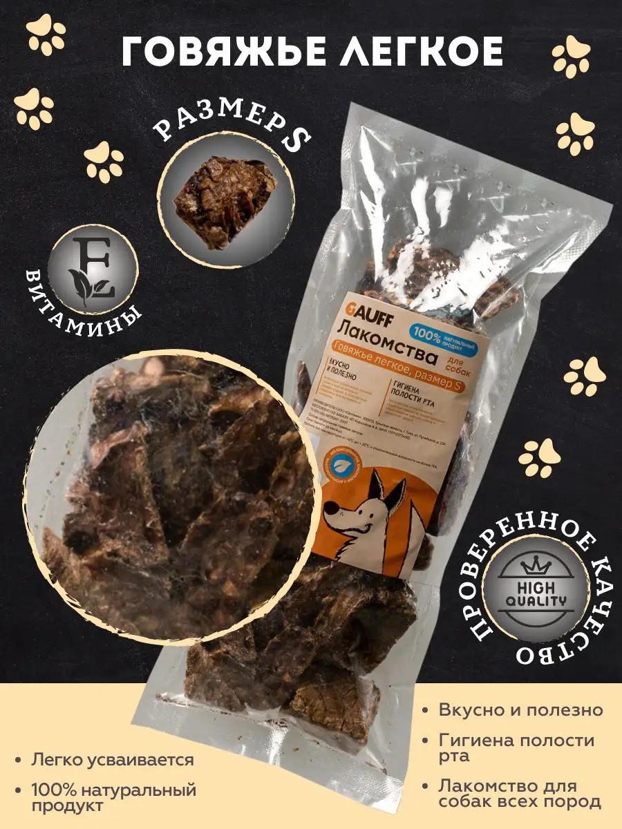 С любовью к вам и вашим питомцам!Самое вкусное и натуральное лакомство от Бабака всегда может быть у вас под рукой для поощрения вашего четвероногого любимца.Говяжье легкое - это натуральное лакомство для вашего четвероногого друга.Этот продукт является качественным белком, содержащий при этом целый комплекс жизненно важных витаминов и микроэлементов.Сюда можно отнести: железо, кальций, фосфор, йод, серу, натрий, магний, калий, а также витамины В и С.Наличие белка позволяет щенку быстрее расти, увеличивает мышечную массу.Говяжье легкое является приятным дополнением к повседневному рациону питомца.Имея небольшие размеры,их удобно брать с собой на прогулку и в дорогу.Является отличным поощрением во время дрессировок.Говяжье легкое, помогает животным имеющим проблемы с бронхами.Витаминный состав улучшает деятельность пищеварительного тракта. Это полезно для питомцев, которые много бегают, проводят время на свежем воздухе.При расщеплении высвобождаются именно те составляющие, которые нужны для развития и восстановления легких. Полезно давать легкое щенкам спортивных пород, которым нужно развивать дыхательную систему.
