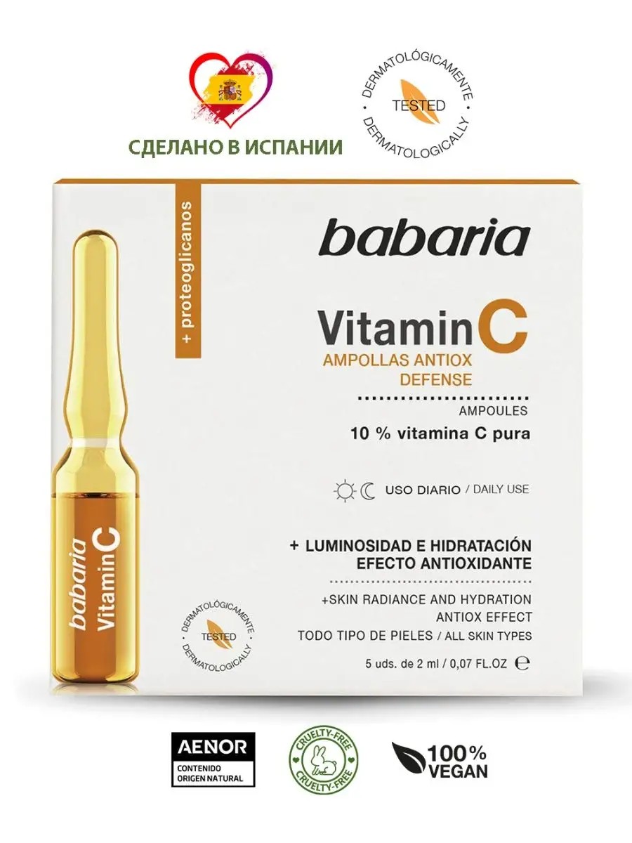 Увлажняющая антиоксидантная сыворотка для лица в ампулах с 10% чистым Витамином С от испанского бренда Babaria – это эффективное антиоксиданстное средство, которое борется со свободными радикалами тем самым замедляя процесс старения. Ампулы с Витамином С и протеогликанами придают коже сияние, увлажняют и улучшают текстуру, в тоже время предотвращают преждевременное старение, благодаря их антиоксидантным свойствам и способности бороться со свободными радикалами. Можно использовать как флэш продукт в качестве «шокового» ухода, для быстрого и видимого эффекта перед праздником или свиданием. Восстанавливающее популярное ампульное средство подходит для всех типов кожи: жирной, проблемной, возрастной, комбинированной и чувствительной. Витамин С способствует выработке натурального коллагена кожи, а протеогликаны обеспечивают глубокое увлажнение, этим самым востанавливают обезвоженную, тусклую и безжизненную кожу. Натуральное премиум - средство содержит гиалуроновую кислоту, обладает лифтинг - эффектом, обеспечивает увлажнение и сохранение молодости и красоты кожи лица и шеи. Упругость и гладкость кожи этой зоны напрямую зависят от профилактики старения.Небольшой объем ампул позволяет использовать их в качестве дорожного средства для сохранения красоты, правильного дневного и ночного ухода за кожей. Омолаживающая легкая биоактивная сыворотка в ампулах по 2 мл предлагается в наборах по 5 штук в каждом. Жидкая основа сыворотки - несмывашка – это эффективное средство в борьбе со старением, которая обеспечивает качественное питание, выравнивание тона и защиту кожи, она подходит для мужчин и женщин. Полезные свойства качественной уникальной сыворотки проявляются на порядок выше при одновременном использовании их с другими средствами серии бренда. Такая инновационная активная сыворотка станет идеальным подарочным сюрпризом в красивой упаковке для девушек и женщин. У нас есть акции и распродажи, вы можете купить наши товары в подарок со скидкой!