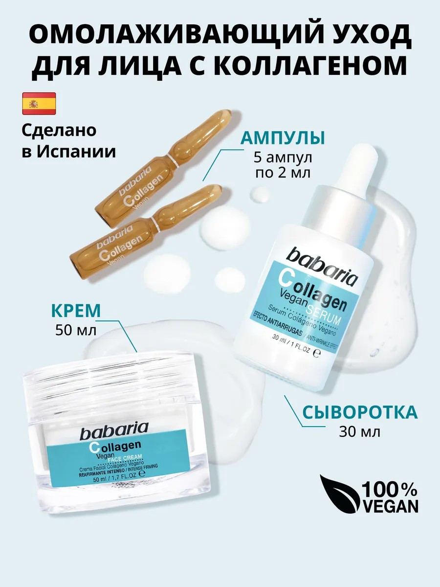 Трехступенчатый, омолаживающий, комплексный уход для лица Babaria с коллагеном. В набор входят 5 ампул по 2мл, сыворотка (30мл) и крем (50мл). Идеально подойдет для омоложения кожи всех типов, включая нормальную, сухую, жирную, комбинированную, обезвоженную, чувствительную.Коллаген — главный активный компонент — создает на коже защитный влагоудерживающий слой, оказывает суперувлажняющий эффект и ускоряет регенерацию, восстанавливая эластичность, упругость, сияние кожи. Коллаген, используемый в составе, произведен в лабораторных условиях из дикорастущих растений.Ампулы с коллагеном Babaria Vegan обладают антивозрастным эффектом и омолаживают кожу. Они помогают уменьшить длину и глубину морщин в области «гусиных лапок», действуют против дряблости кожи и устраняют сухость и шелушение.Веганская сыворотка для лица идеальное лицо уменьшает мимические морщинки. Витамин В в составе восстанавливает естественный баланс влаги в коже и запускает процесс регенерации. Через 30 минут «гусиные лапки» становятся меньше. Через 7 дней уменьшается дряблость кожи. Эффект лифтинга после применения средства сохраняется в течение 28 дней. Легкая, быстро впитывающаяся сыворотка подойдет для поддержания красоты кожи лица, шеи, век, декольте. Подойдет как лифтинг сыворотка для лица под макияж.Коллагеновый крем для лица Babaria устраняет морщины и «гусиные лапки», а также поддерживает молодость кожи. Активные компоненты сквален и витамин Е образуют защитный барьер, способствуют укреплению, уплотнению кожи. Сквален защищает от негативного влияния извне и имеет выраженные антиоксидантные свойства. Витамин Е активно увлажняет женскую и мужскую кожу, дополняет действие солнцезащитных средств и обеспечивает профилактику фотостарения.Дерматологически протестировано. Веган 100%. Уходовая косметика не тестируется на животных. Содержит высокий процент натуральных компонентов (90-99%), что подтверждено сертификатом AENOR. Для женщин и мужчин. Подойдет в качестве подарка маме, подруге, сестре, коллегам.
