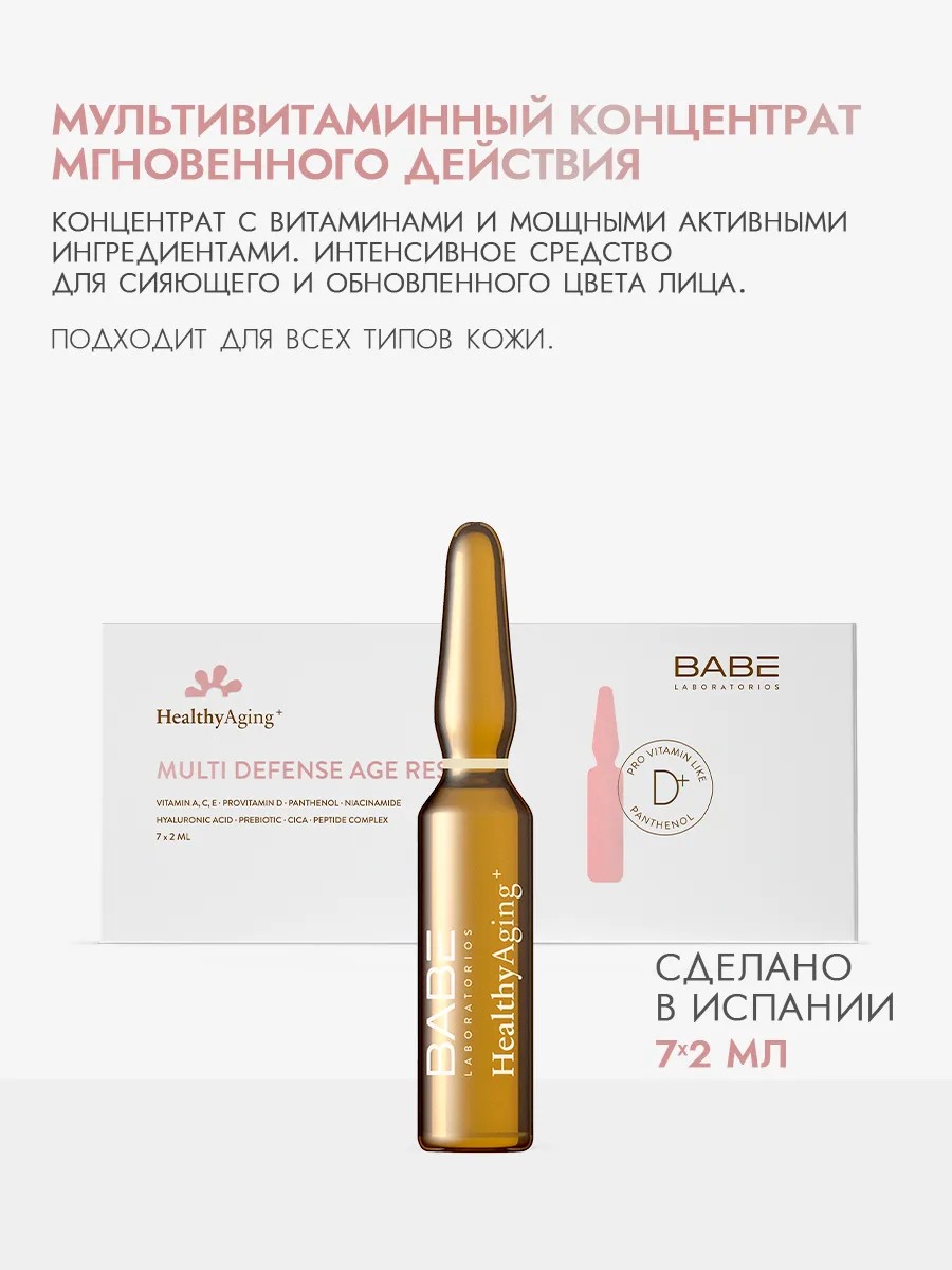 | Полное наименование товара | "LABORATORIOS ВАВЕ" Концентрат мгновенного действия с мультивитаминным комплексом / MULTI DEFENSE AGE RESCUE, 7x2 мл |