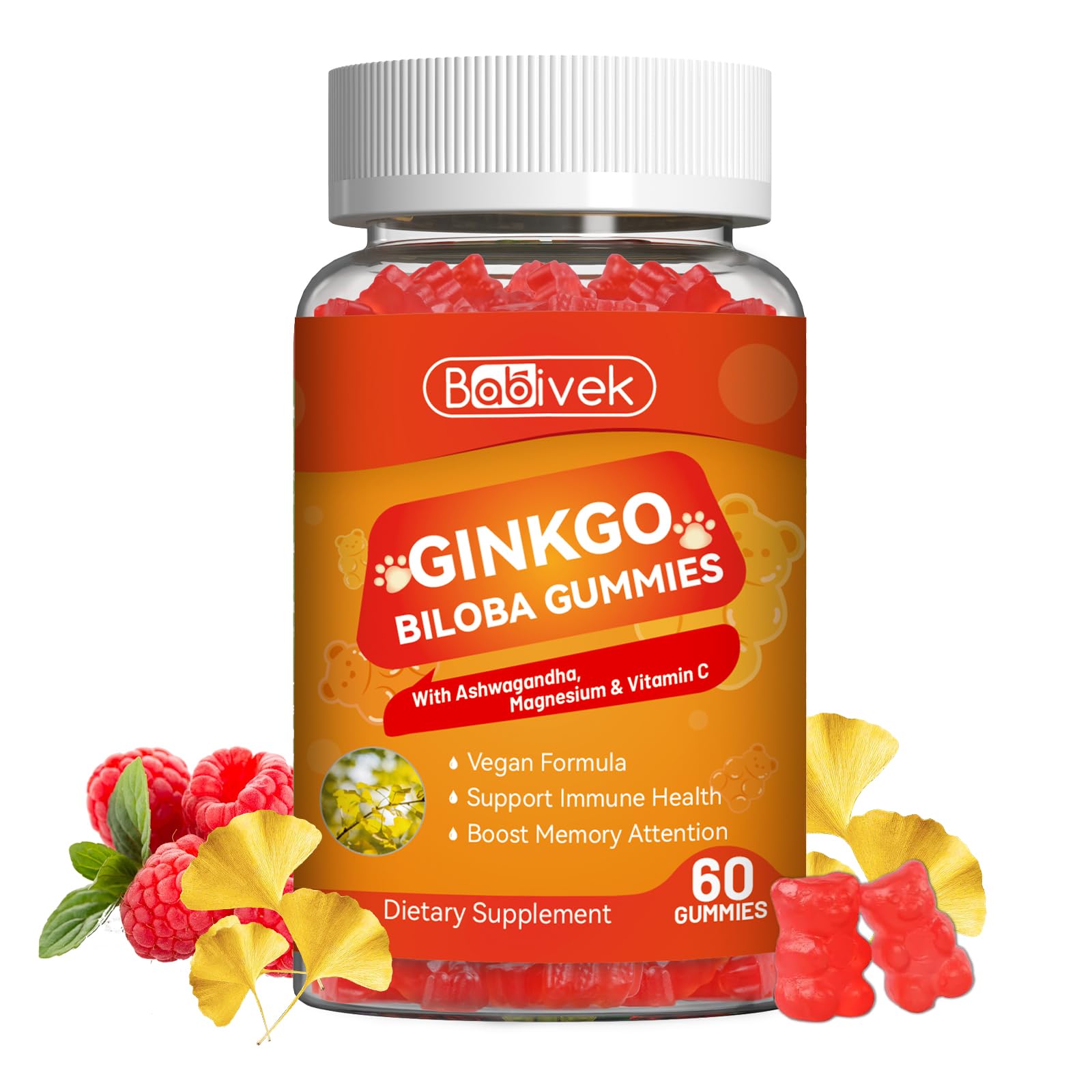 Babivek Ginkgo Biloba Gummies with Ashwagandha Vitamin C & Magnesium - Vegan Non-GMO Gluten-Free - Raspberry Flavor 60 Count